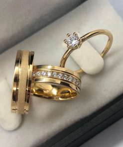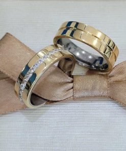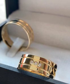 Alianças de Casamento 8mm | Modelo com 2 Frisos Laterais | Feminina com 3 Pedras Centrais