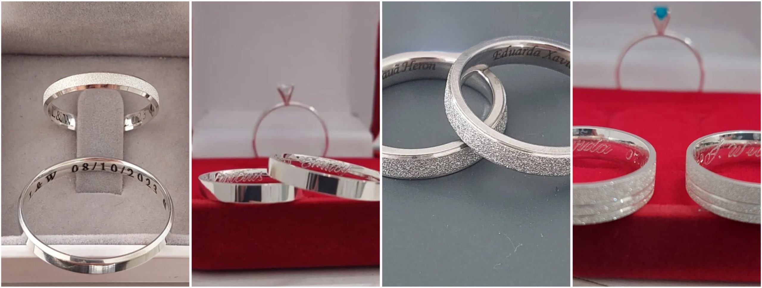 Alianças gravadas com nomes, datas ou promessas, seja com gravação a laser, que oferece precisão e acabamento sofisticado, ou gravação manual, que traz um toque artesanal e único à peça