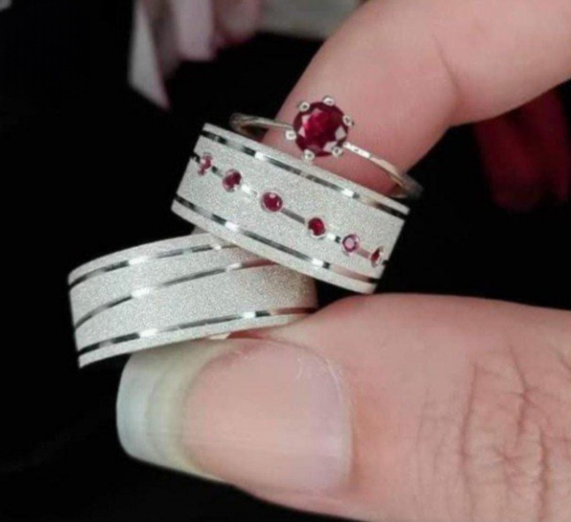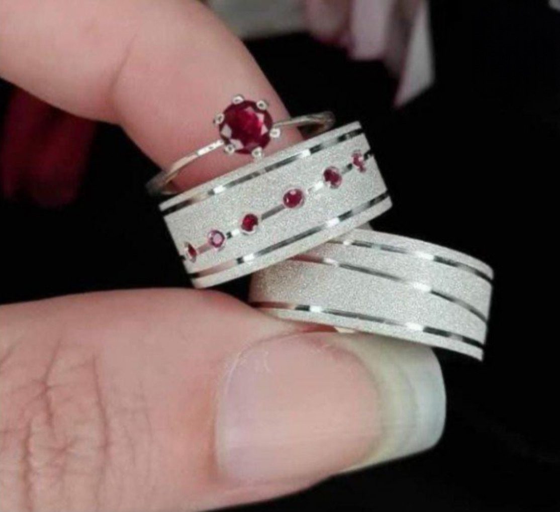 As Alianças de Namoro em Prata 950, com 8mm de largura, apresentam um design sofisticado e imponente. O acabamento diamantado com 2 frisos canto a canto e 1 friso central ondulado confere um toque moderno e refinado à peça. No modelo feminino, 7 pedras de zircônia na cor vinho são delicadamente cravadas dentro do friso ondulado, proporcionando um brilho único e elegante. O modelo masculino mantém o mesmo acabamento, porém sem as pedras, garantindo um visual clássico e equilibrado. Para complementar o conjunto, há a opção de incluir um anel solitário cravejado com pedra de zircônia, agregando ainda mais sofisticação ao modelo.