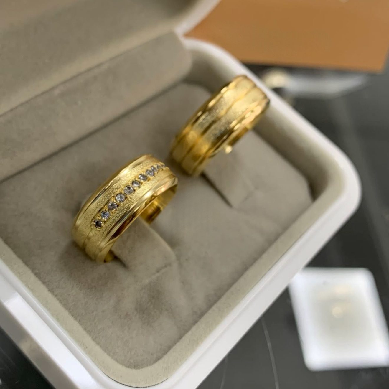 A aliança feminina se destaca com 15 pedras de zircônia centrais posicionadas em meia volta, garantindo um brilho delicado e elegante. O modelo ideal para casais que buscam uma joia com presença e estilo.