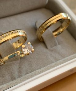 Este par de alianças de ouro 18K é ideal para casais que valorizam o equilíbrio entre tradição e sofisticação. Com 4mm de largura, o modelo chanfrado semi-anatômico com friso central proporciona um visual moderno e elegante, sem abrir mão do conforto no uso diário.