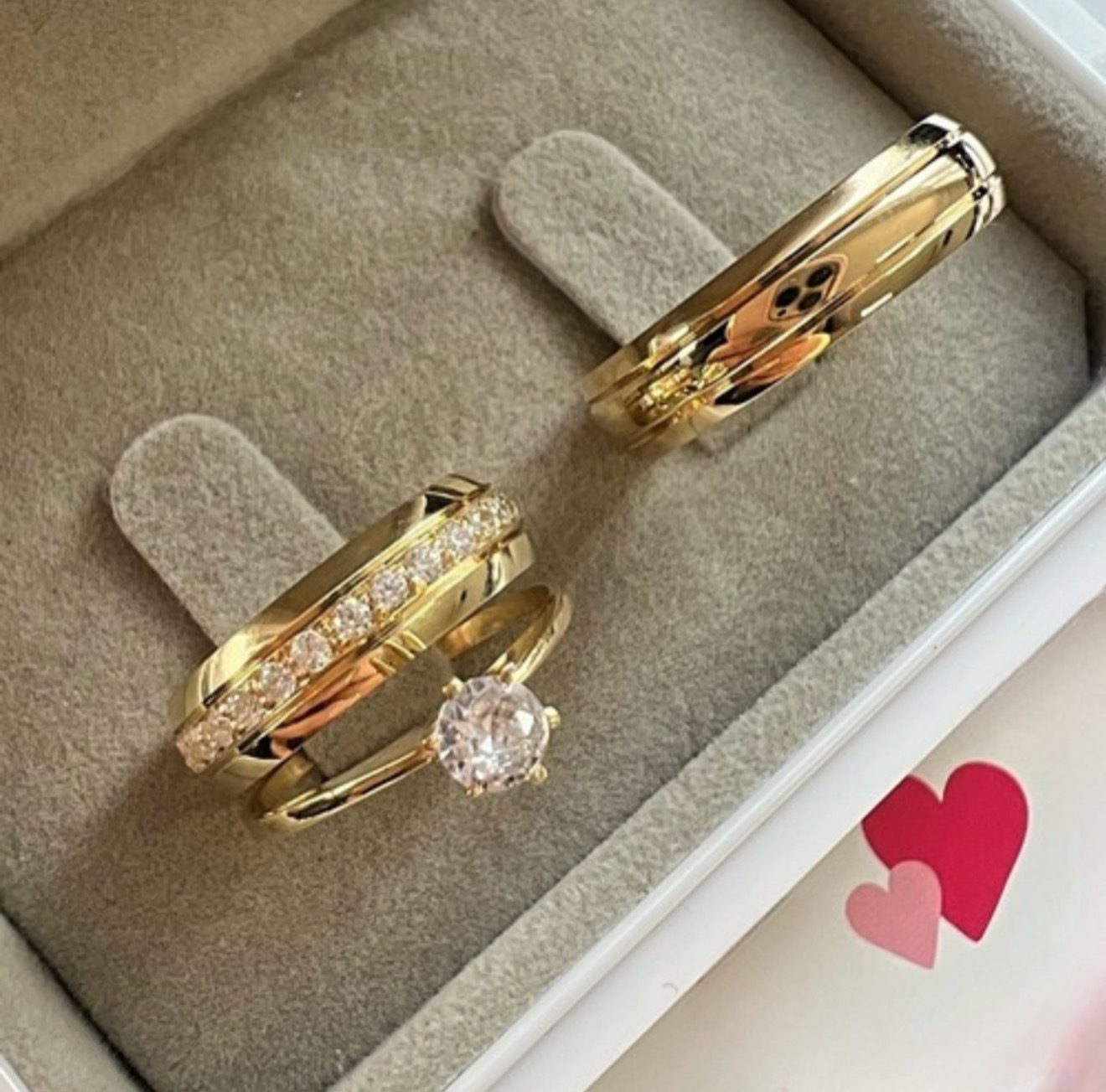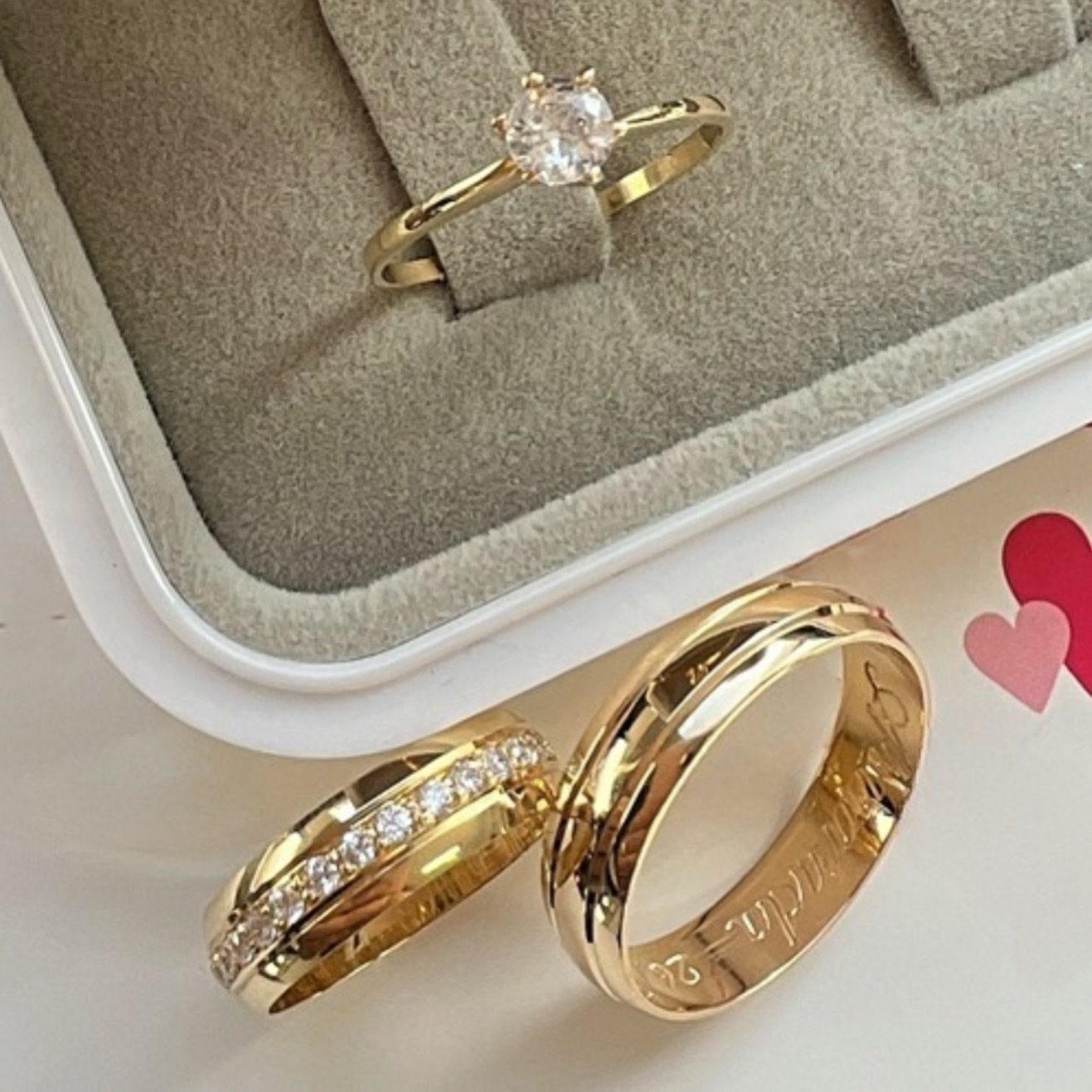 A aliança feminina é delicadamente detalhada com 15 pedras de zircônia em meia volta, além de 2 frisos laterais, que destacam o brilho e conferem um toque luxuoso. Já a aliança masculina mantém o visual tradicional e elegante, sendo lisa com 3 frisos polidos, garantindo harmonia perfeita entre o par.