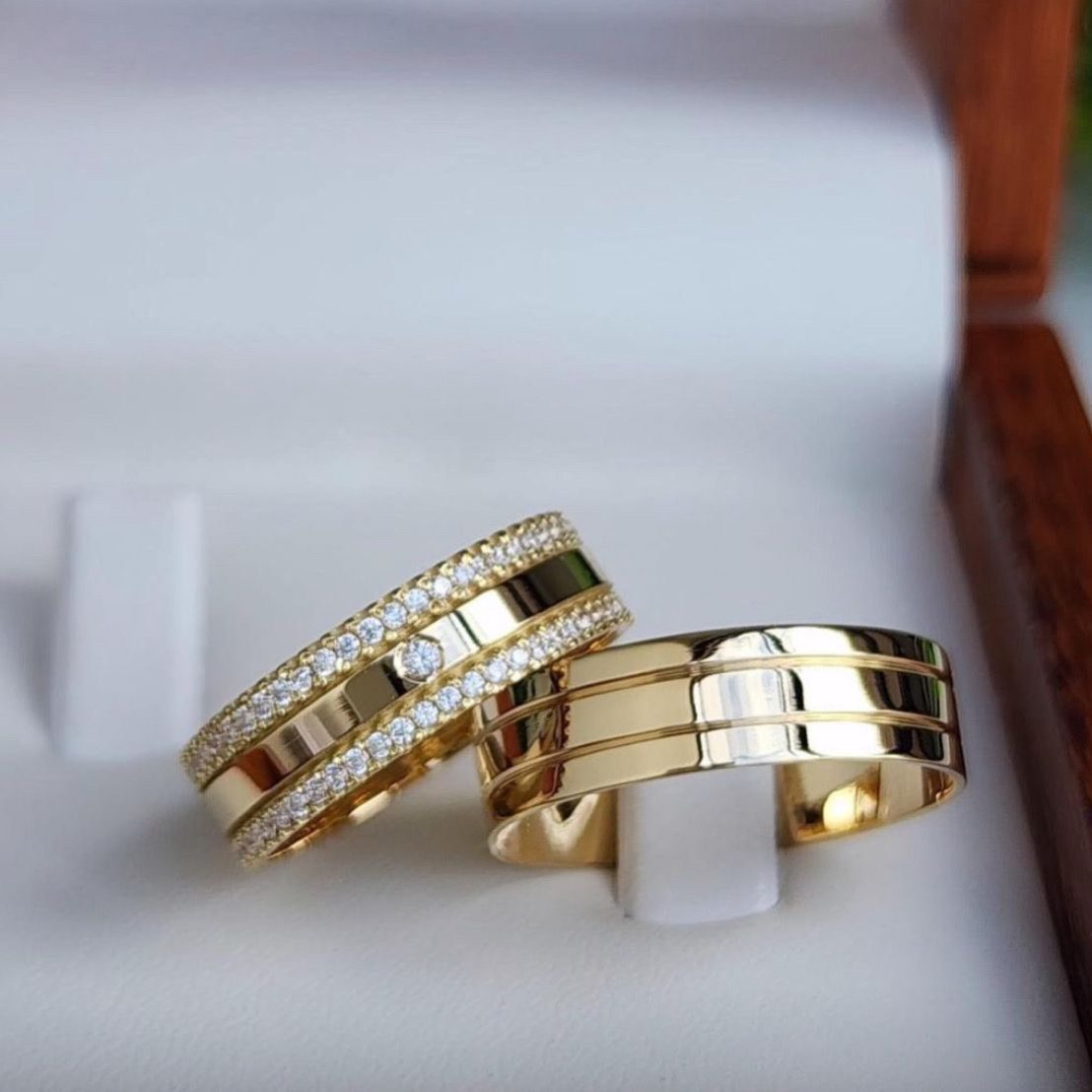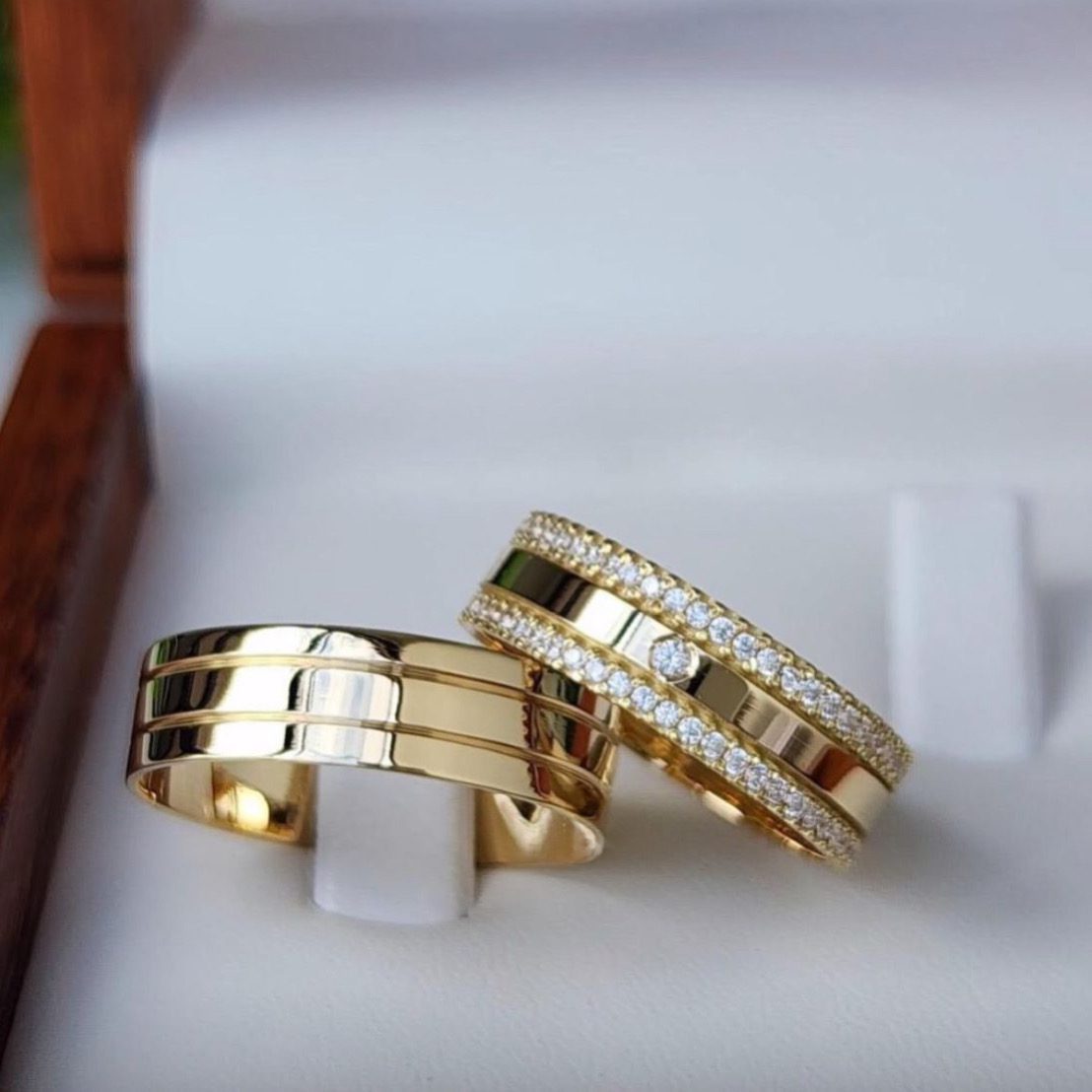 As Alianças de Casamento Moeda Antiga 6mm anatômico, trazem um design encantador e sofisticado, com a aliança feminina adornada por 60 pedras de zircônia, distribuídas ao longo de toda a volta, proporcionando um brilho intenso. Além disso, a peça feminina conta com uma pedra de zircônia central, destacando ainda mais sua elegância. A aliança masculina possui 2 frisos laterais canto a canto, mantendo o estilo clássico e moderno. Ambas as alianças apresentam acabamento semi anatômico para garantir conforto e durabilidade, com o banho de ouro 18k para resistir ao uso diário e manter o brilho.