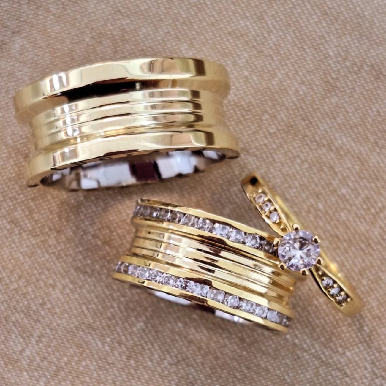 O modelo estilo Bulgari de 10mm é uma escolha sofisticada e imponente para casais que buscam alianças luxuosas e marcantes. Fabricadas em moeda antiga e banhadas a ouro 18k, essas alianças combinam design moderno com alta durabilidade. A aliança feminina possui aproximadamente 60 pedras de zircônia cravejadas, sendo 30 de cada lado, com a quantidade variando conforme o tamanho da peça. O modelo masculino, robusto e elegante, apresenta dois frisos centrais, mantendo o estilo clássico Bulgari. Além disso, oferecemos a opção de gravação a laser e anel solitário incluso para complementar o conjunto.