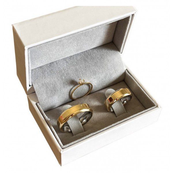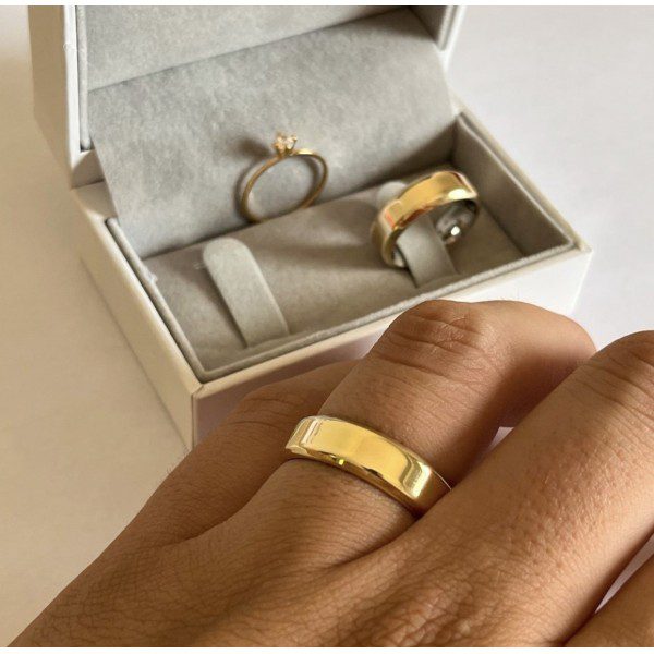 É uma aliança com estrutura interna de aço cirúrgico, recoberta por uma chapa de Ouro 10K fixada com tecnologia avançada. Essa técnica proporciona a aparência luxuosa do ouro com uma estrutura resistente e confortável, garantindo maior longevidade e brilho intenso.