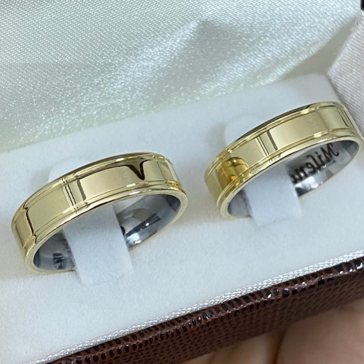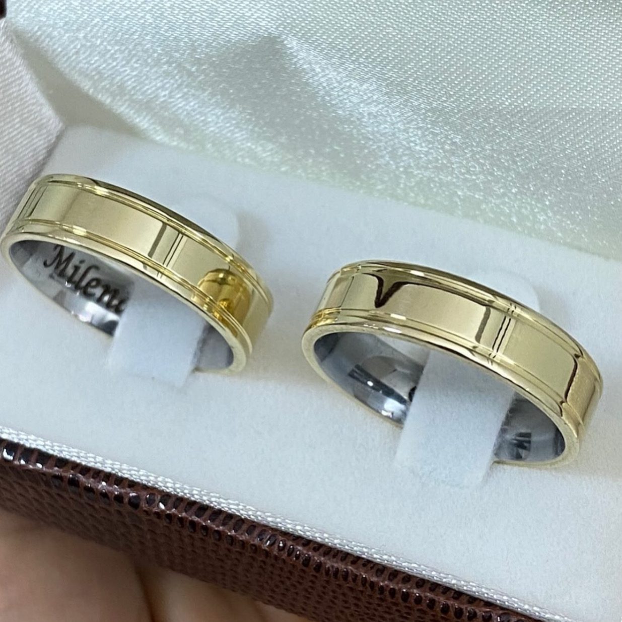As Alianças de Casamento em Ouro 10K com revestimento em prata foram desenvolvidas para casais que buscam sofisticação, resistência e um design moderno. Com acabamento polido e dois frisos laterais de canto a canto, esse modelo une requinte e durabilidade, tornando-se um símbolo perfeito do amor eterno.