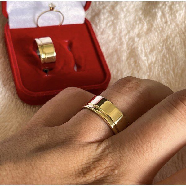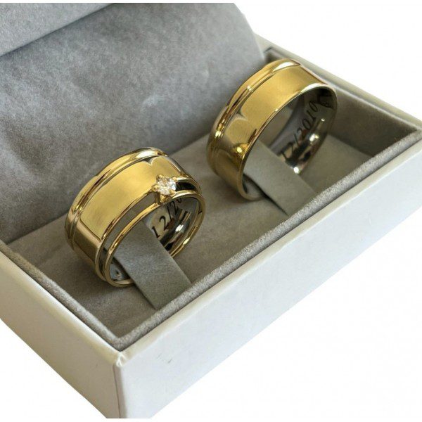 É uma aliança com estrutura interna de aço cirúrgico, recoberta por uma chapa de Ouro 10K fixada com tecnologia avançada. Essa técnica proporciona a aparência luxuosa do ouro com uma estrutura resistente e confortável, garantindo maior longevidade e brilho intenso.
