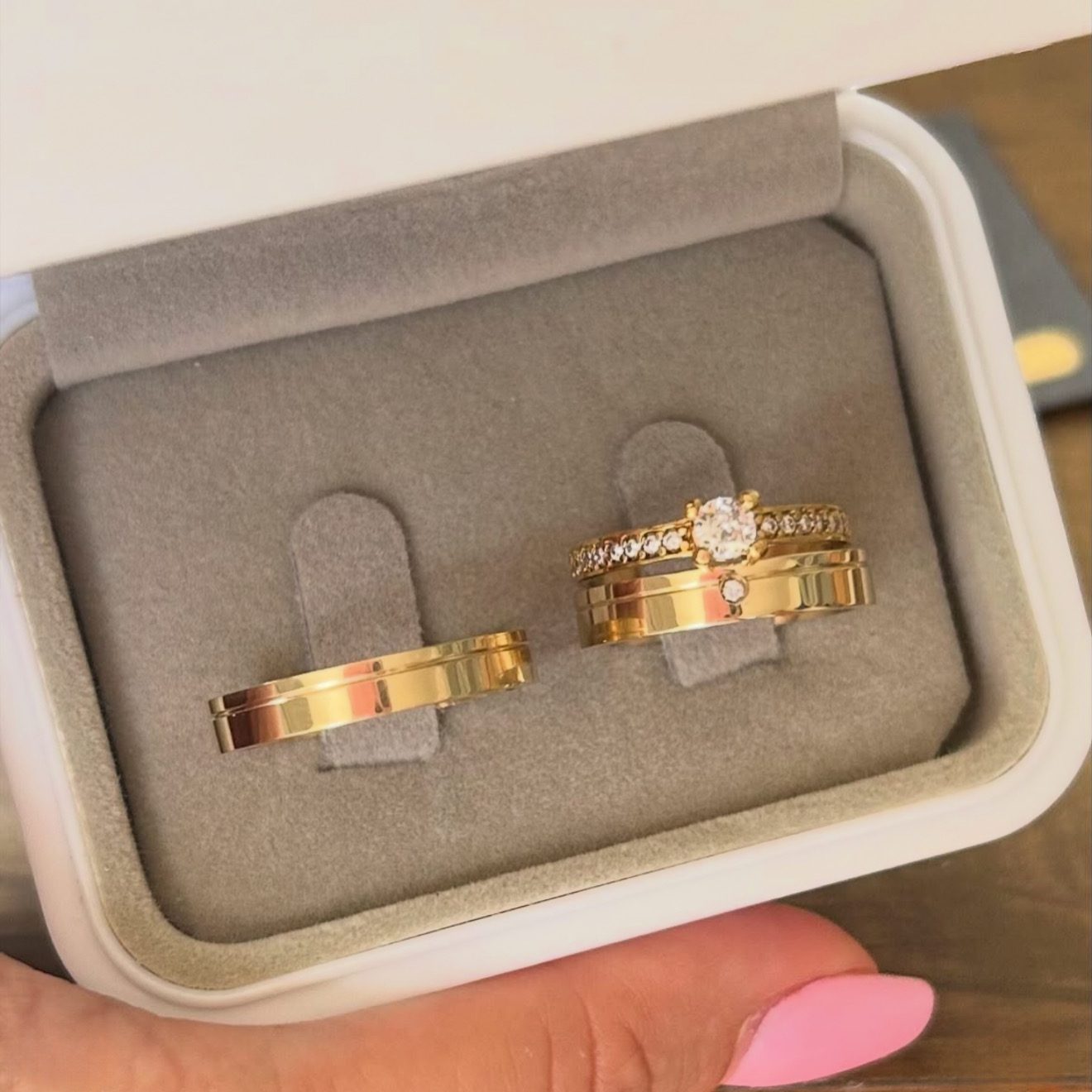 A aliança feminina possui uma pedra de zircônia delicadamente posicionada dentro do friso, acrescentando um charme sutil à peça.