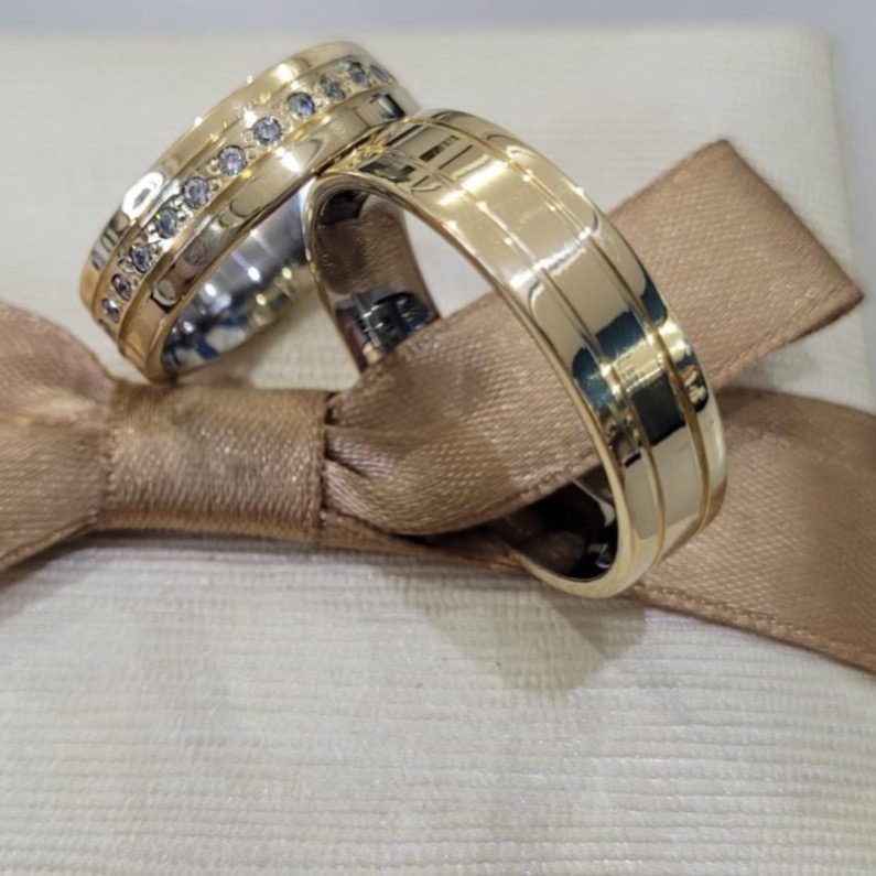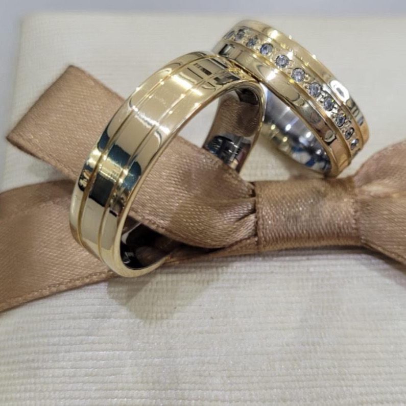 As Alianças de Casamento com 6mm de largura apresentam um design anatômico que alia conforto e elegância para o uso diário. O modelo conta com 2 frisos laterais que realçam seu acabamento sofisticado. Na versão feminina, 15 pedras de zircônia são dispostas em meia volta, proporcionando um brilho marcante e delicado, enquanto o modelo masculino exibe um acabamento liso com os mesmos frisos laterais, garantindo um visual moderno e harmonioso. Além disso, há a opção de incluir um forro em aço cirúrgico para personalização extra e maior durabilidade do conjunto. Essas alianças são confeccionadas a partir de moedas antigas banhadas a ouro 18K, conferindo um toque único e exclusivo à peça.