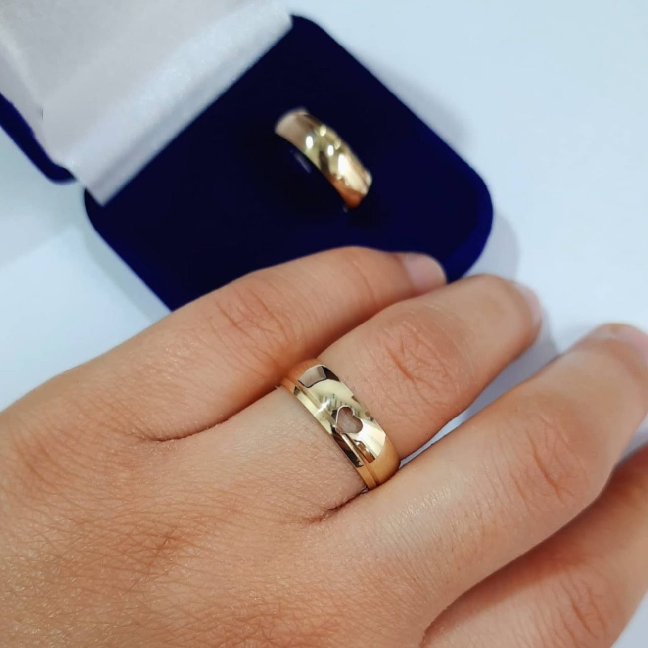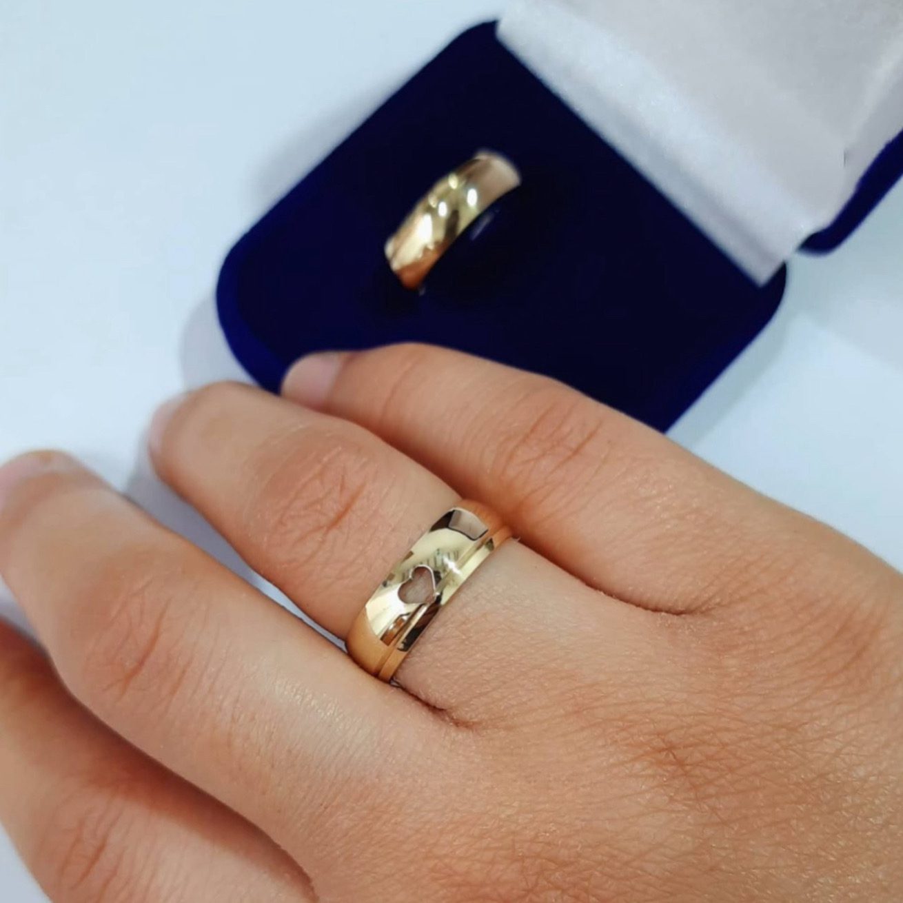 O modelo feminino se destaca com um delicado coração vazado, símbolo do amor e da conexão entre o casal. Já o modelo masculino mantém o visual clássico e liso, com um friso lateral que adiciona um toque de modernidade.