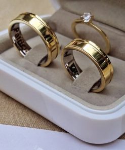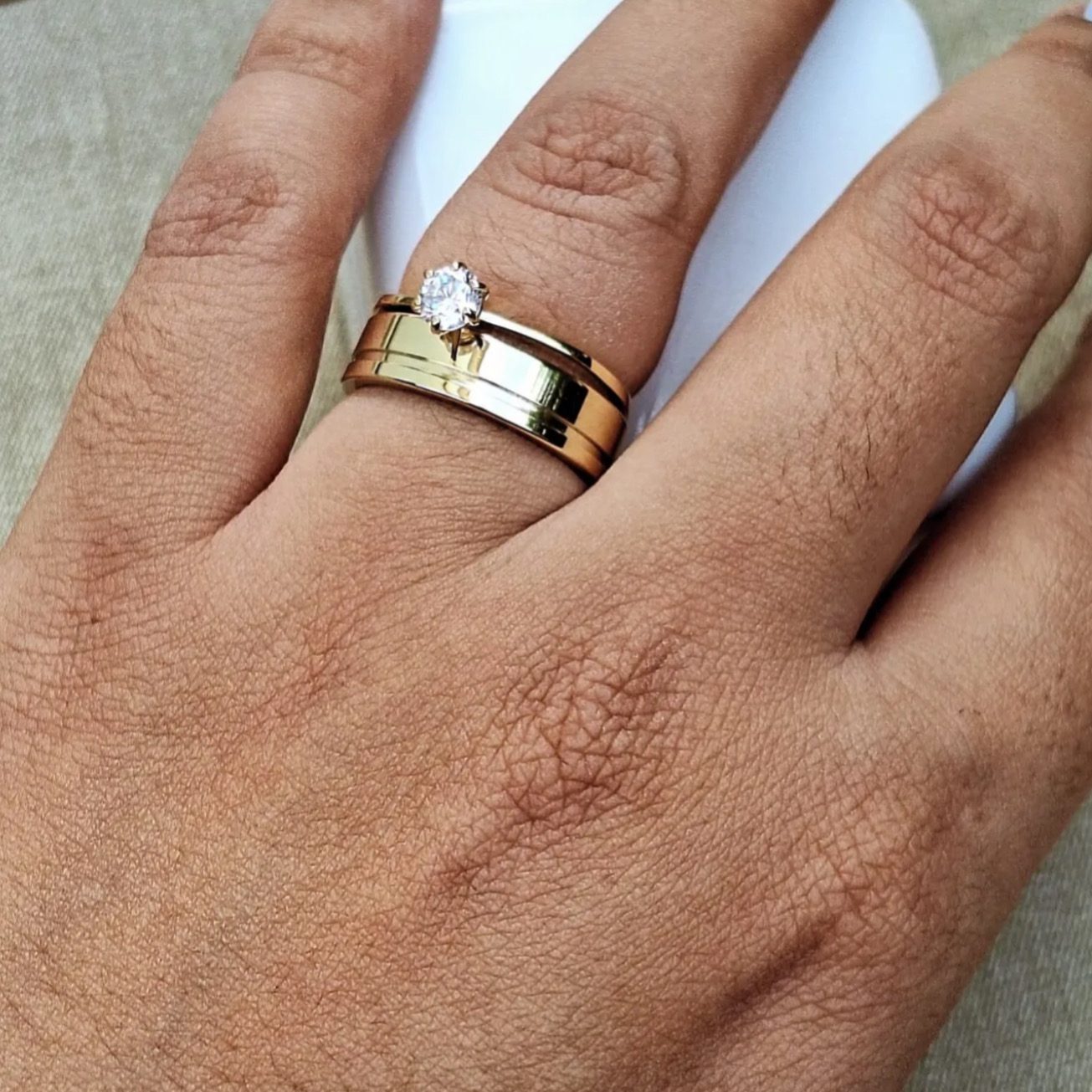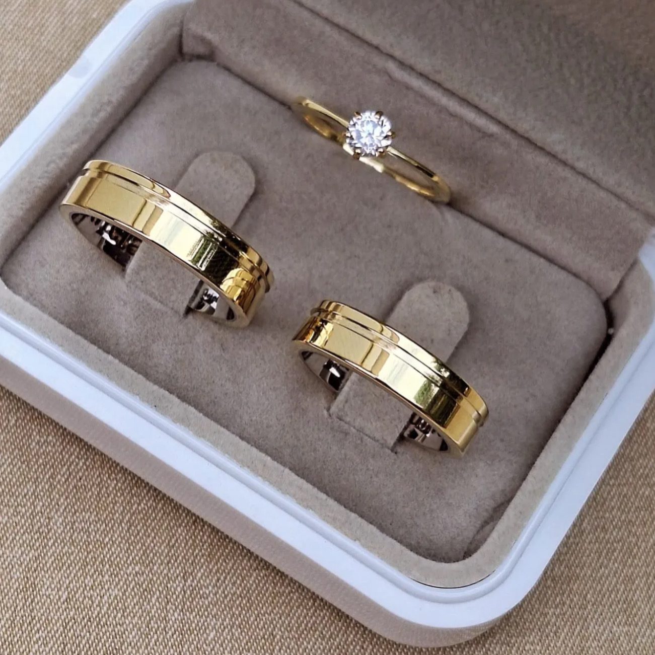 O modelo Valesca 02 é a escolha ideal para casais que buscam sofisticação com um detalhe moderno e elegante Anel solitário incluso