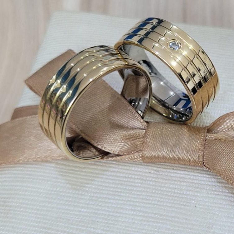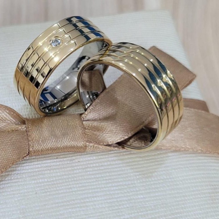 • Par de alianças 8mm (feminina com 1 pedra de zircônia e masculina lisa com 3 frisos).