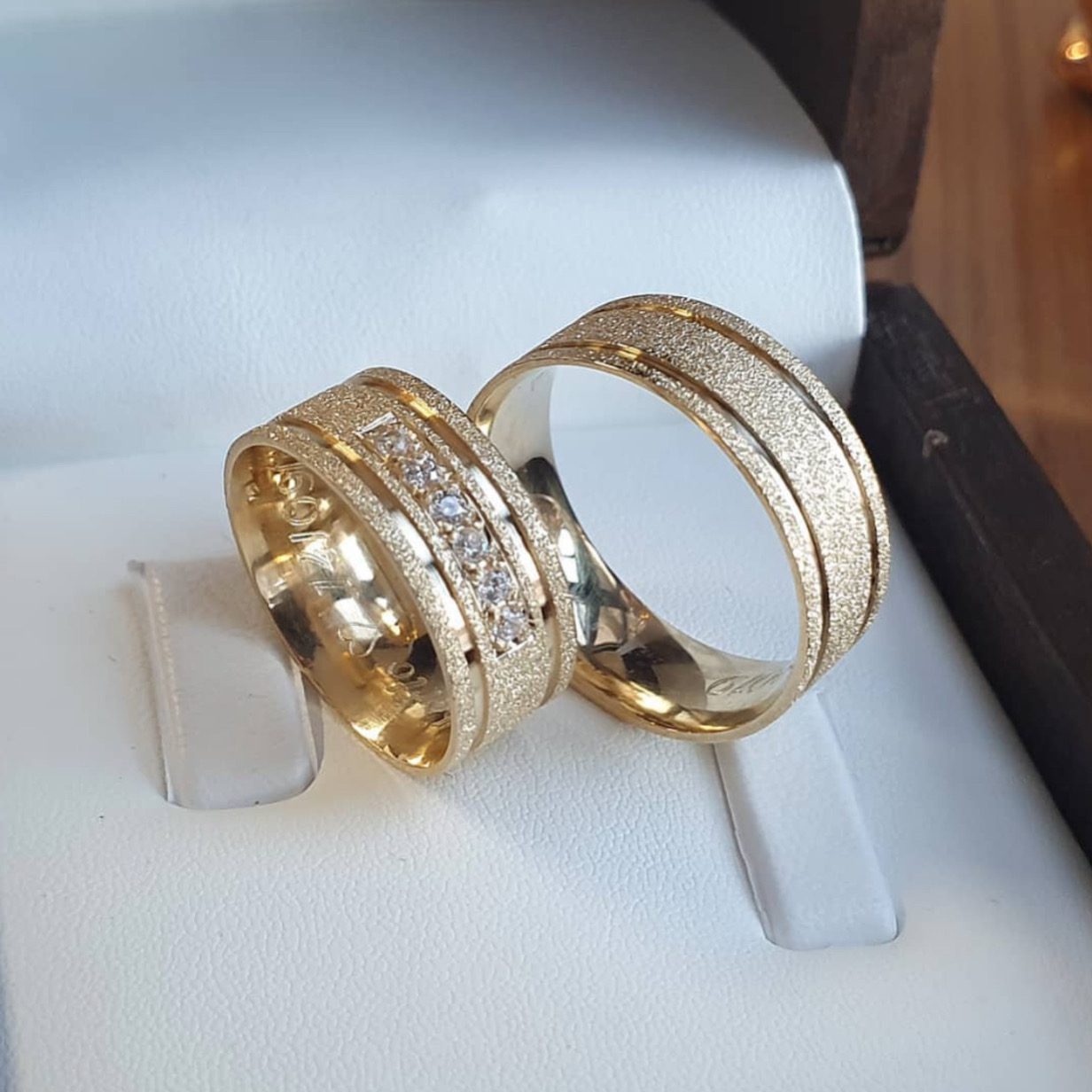 • Par de alianças em moeda antiga (feminina com 6 pedras e masculina com design diamantado).