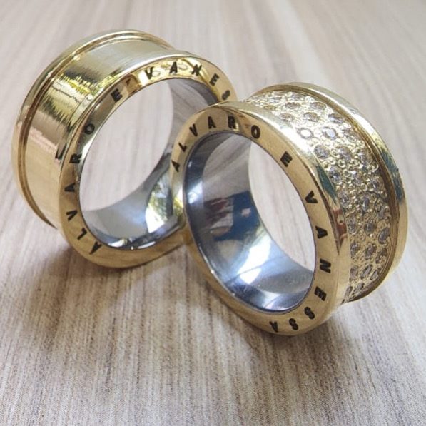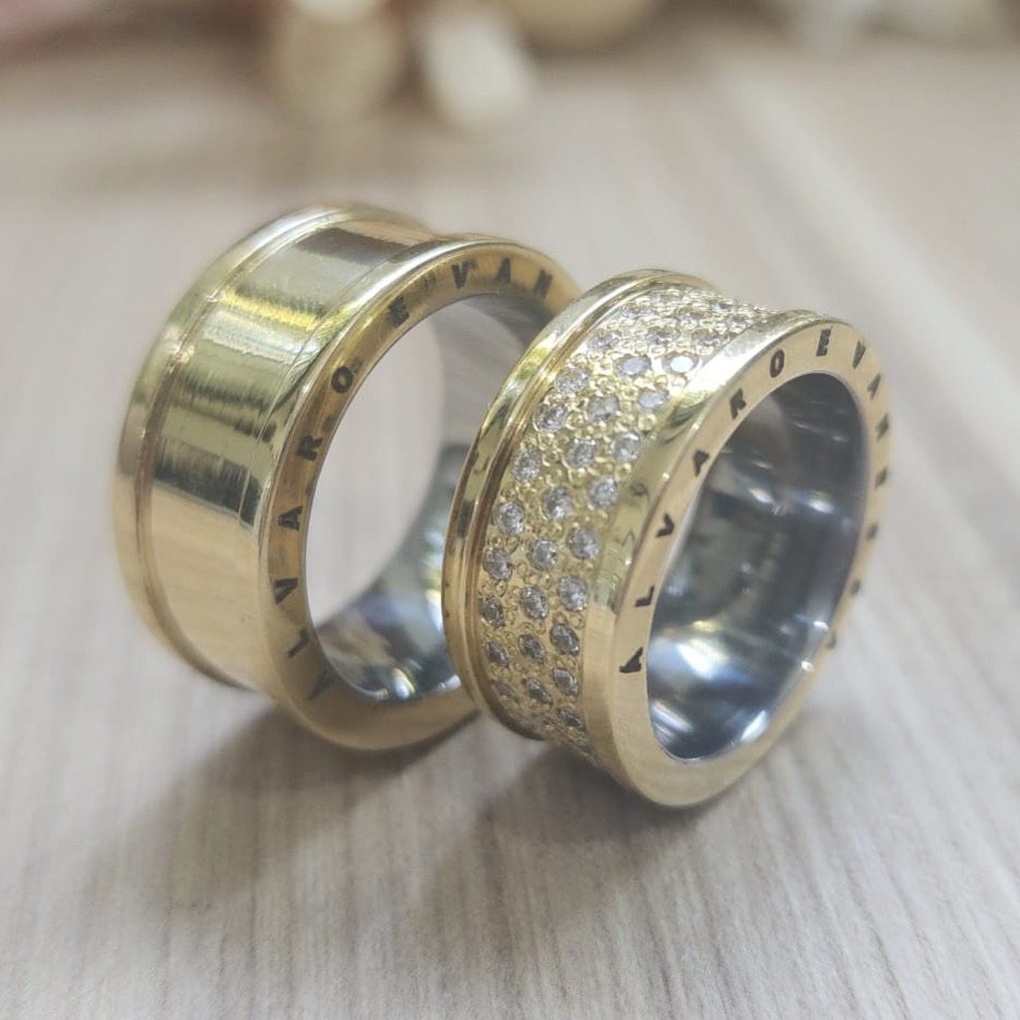 • Par de alianças 10mm estilo Bulgari, com gravação a laser (caso solicitada).