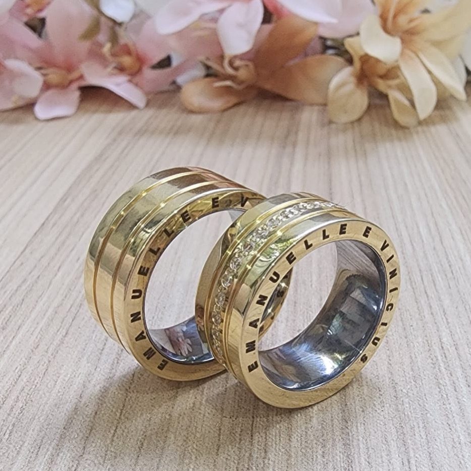 • Oferecemos a opção de gravação no par de alianças. No entanto, pedimos que verifique atentamente os tamanhos antes de solicitar a gravação, pois, em caso de troca devido ao tamanho, a gravação impede a devolução ou troca do produto.