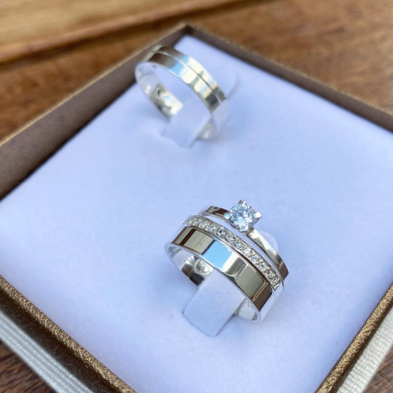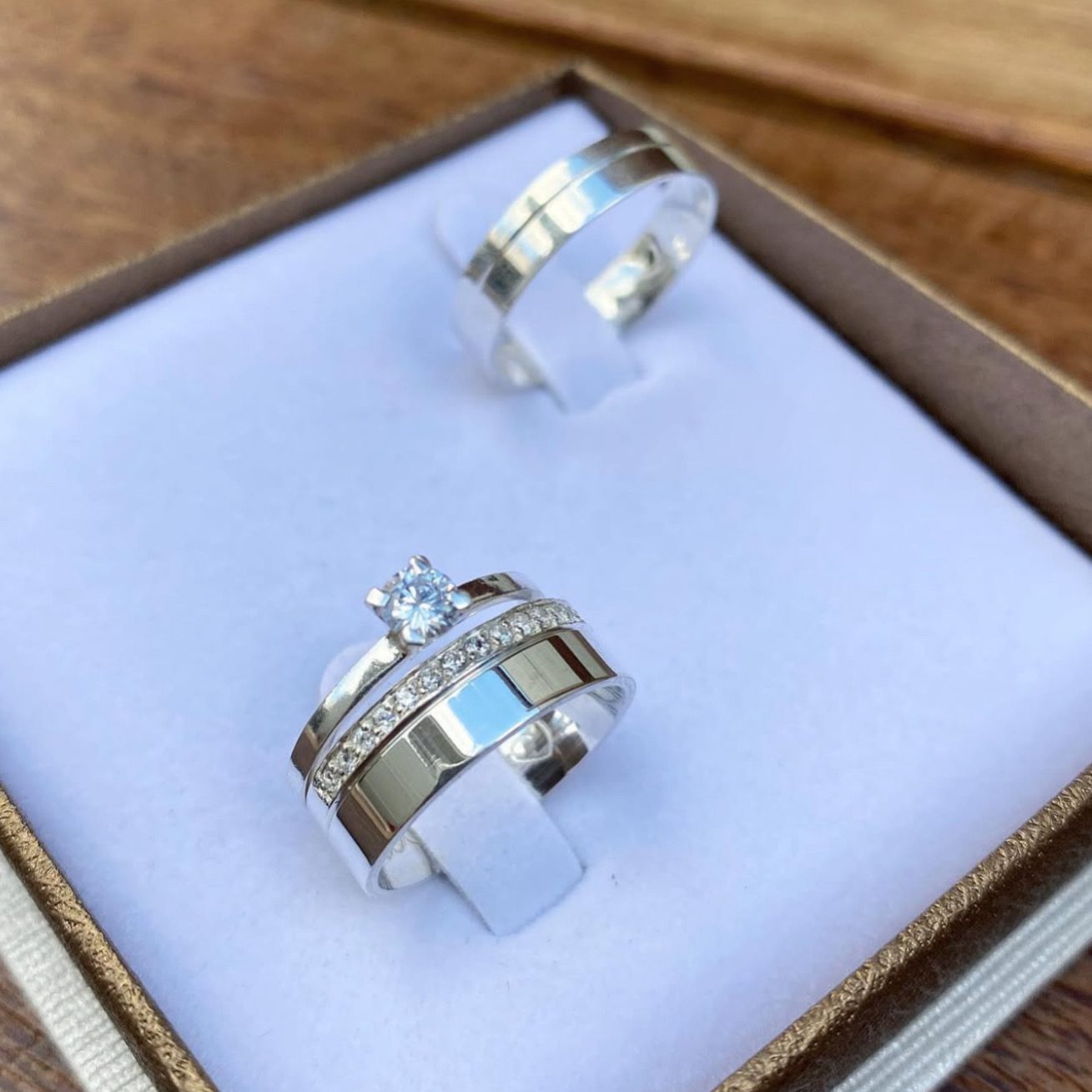 Esse modelo é perfeito para casais que buscam um design sofisticado e moderno, com acabamento polido, friso lateral discreto e um brilho encantador, além do anel solitário incluso para complementar o conjunto.