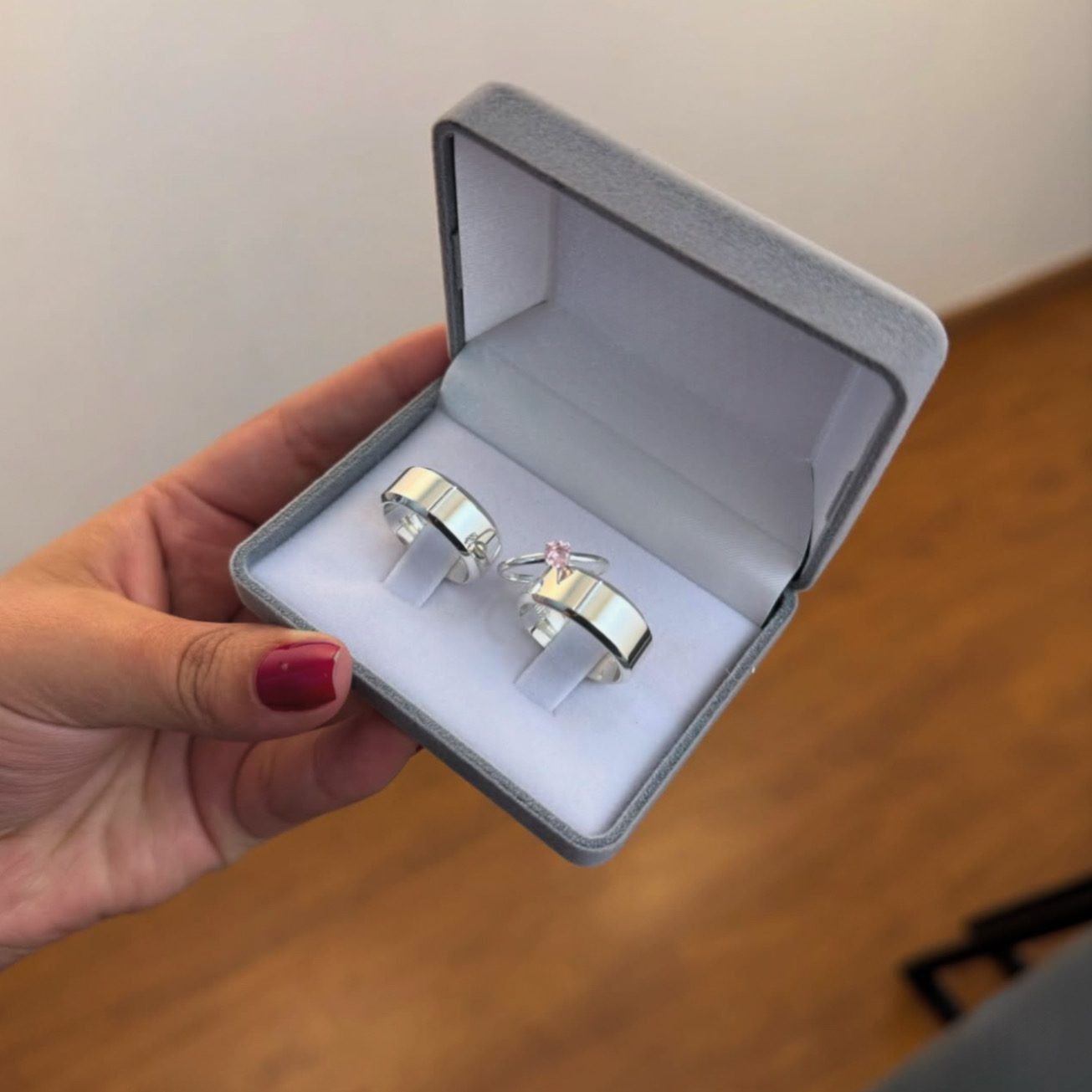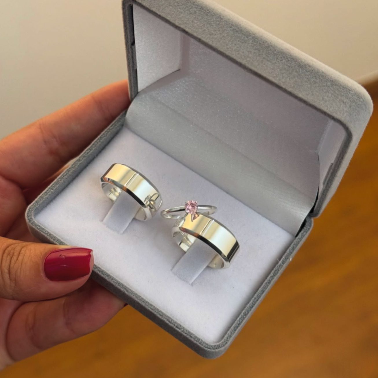 Alianças de Namoro 8mm em Prata 950 | Semi Anatômica | Acabamento Chanfrado e Anel Solitário Opcional Cor Rosa