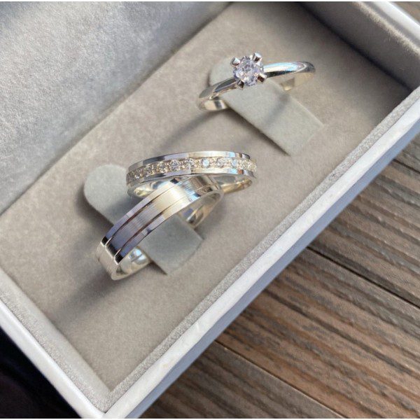 As Alianças de Namoro Modelo Viena, em Prata 950, apresentam um design sofisticado e elegante, perfeito para casais que buscam um modelo delicado e ao mesmo tempo marcante. O modelo feminino possui 3mm de largura e é cravejado com 15 pedras de zircônia centrais (meia volta), conferindo brilho e requinte à peça. Já o modelo masculino, com 5mm de largura, conta com 2 frisos laterais canto a canto, trazendo um acabamento moderno e equilibrado. Ambos os modelos possuem formato semi anatômico, garantindo conforto para o uso diário. Para complementar o conjunto, há a opção de incluir um anel solitário opcional, agregando ainda mais sofisticação à joia.