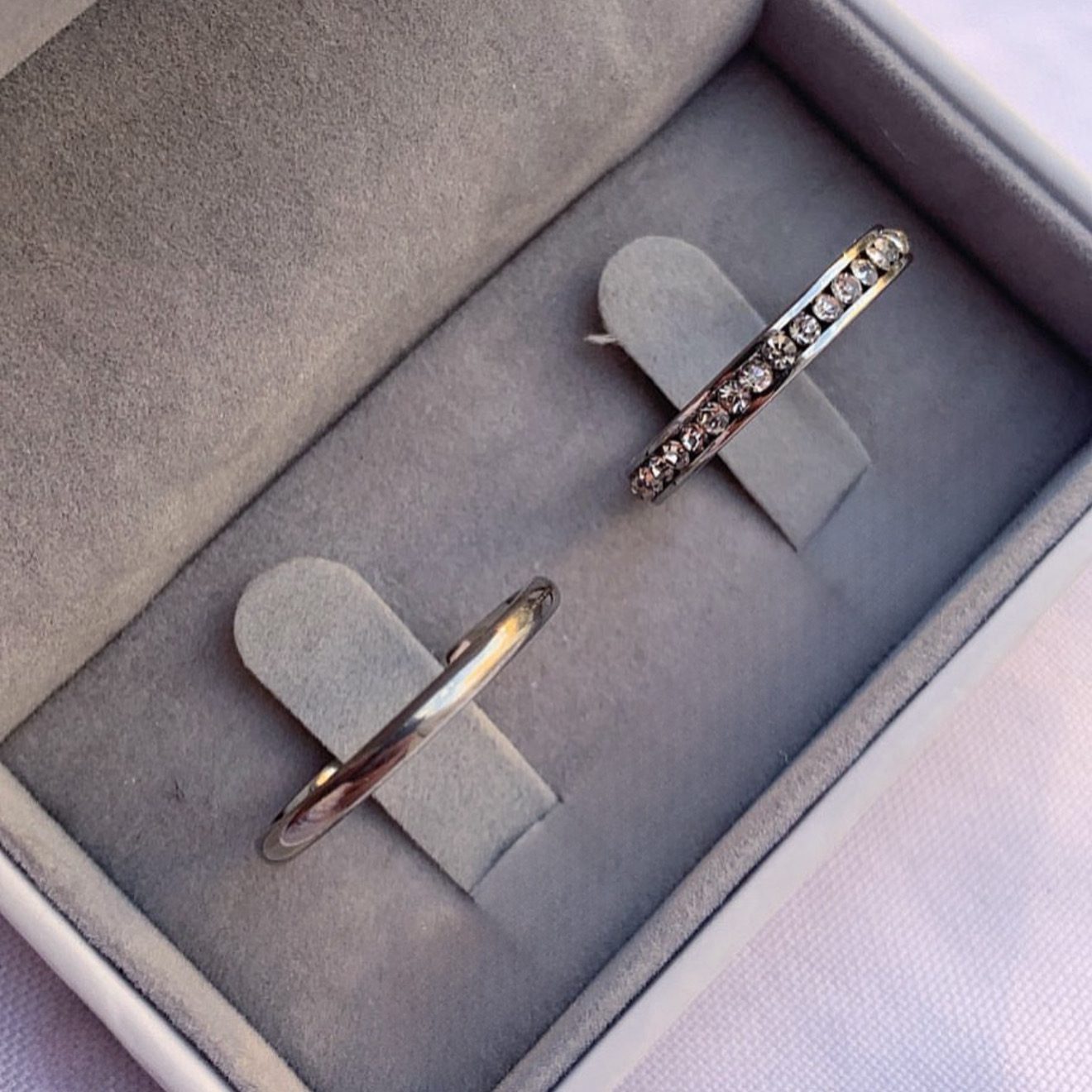 ● Par de alianças prata em aço cirúrgico 1,8mm – feminina reta com zircônias e masculina redonda lisa.