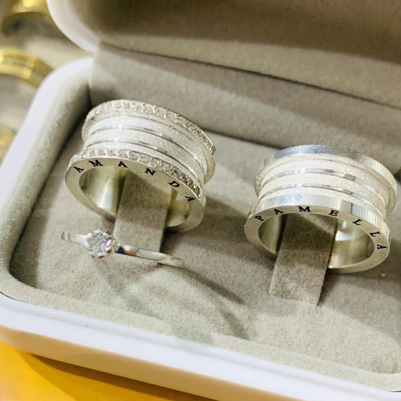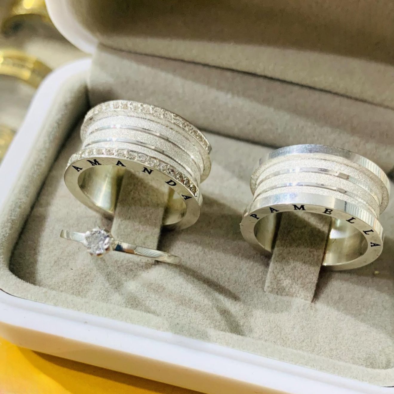 Personalização lateral inclusa com nomes gravados a laser, deixando o modelo exclusivo para o casal.