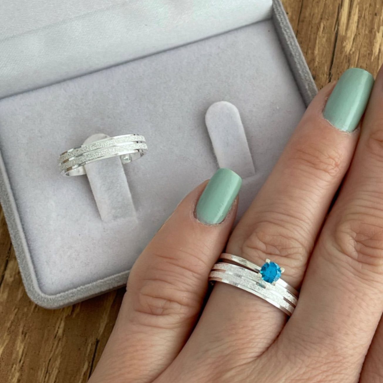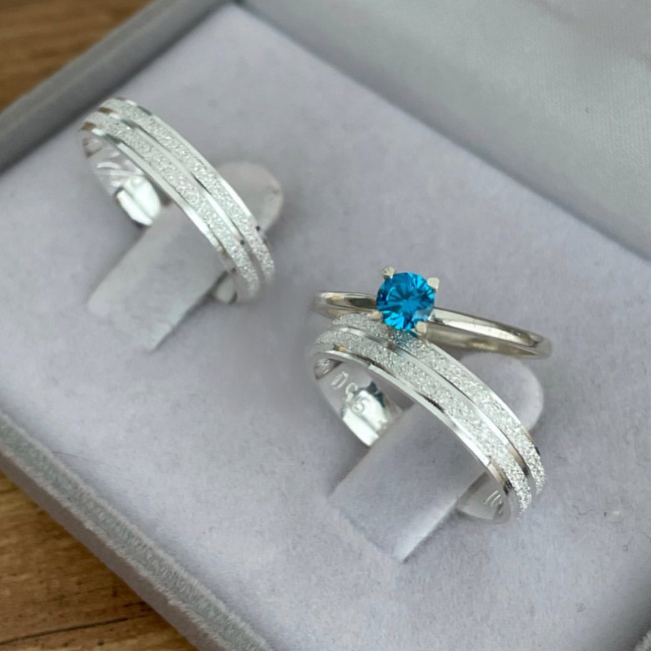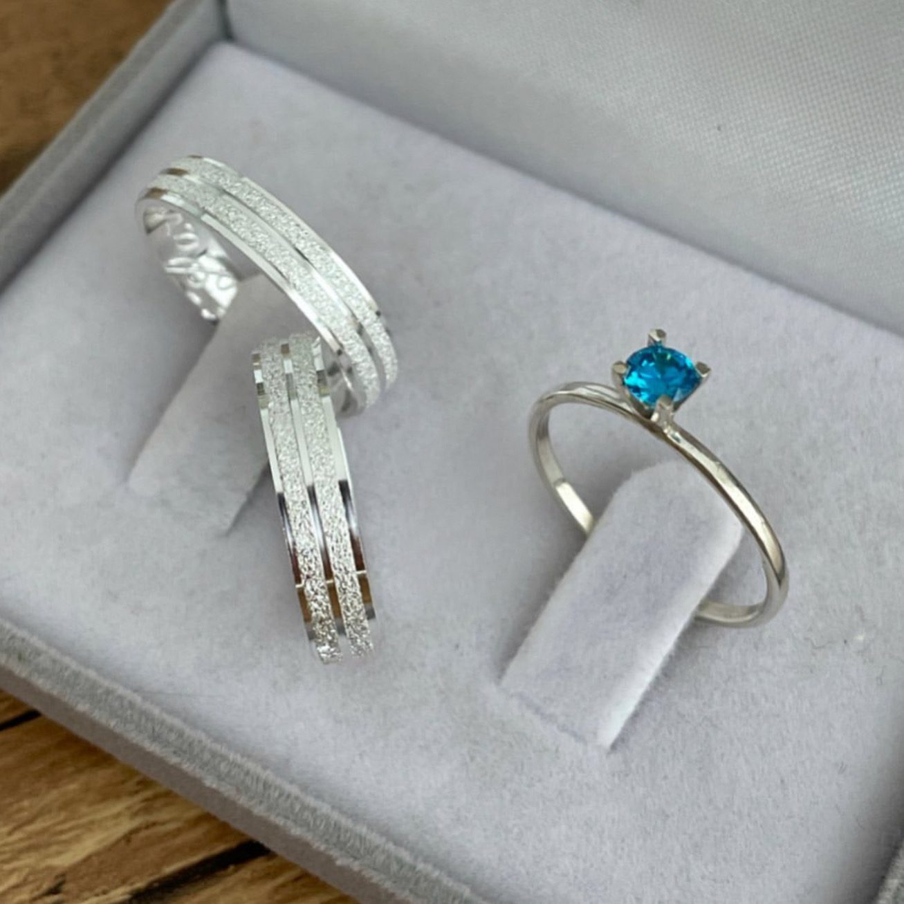 O conjunto acompanha um anel solitário com pedra de zircônia azul, que acrescenta um charme especial e um toque romântico à joia.