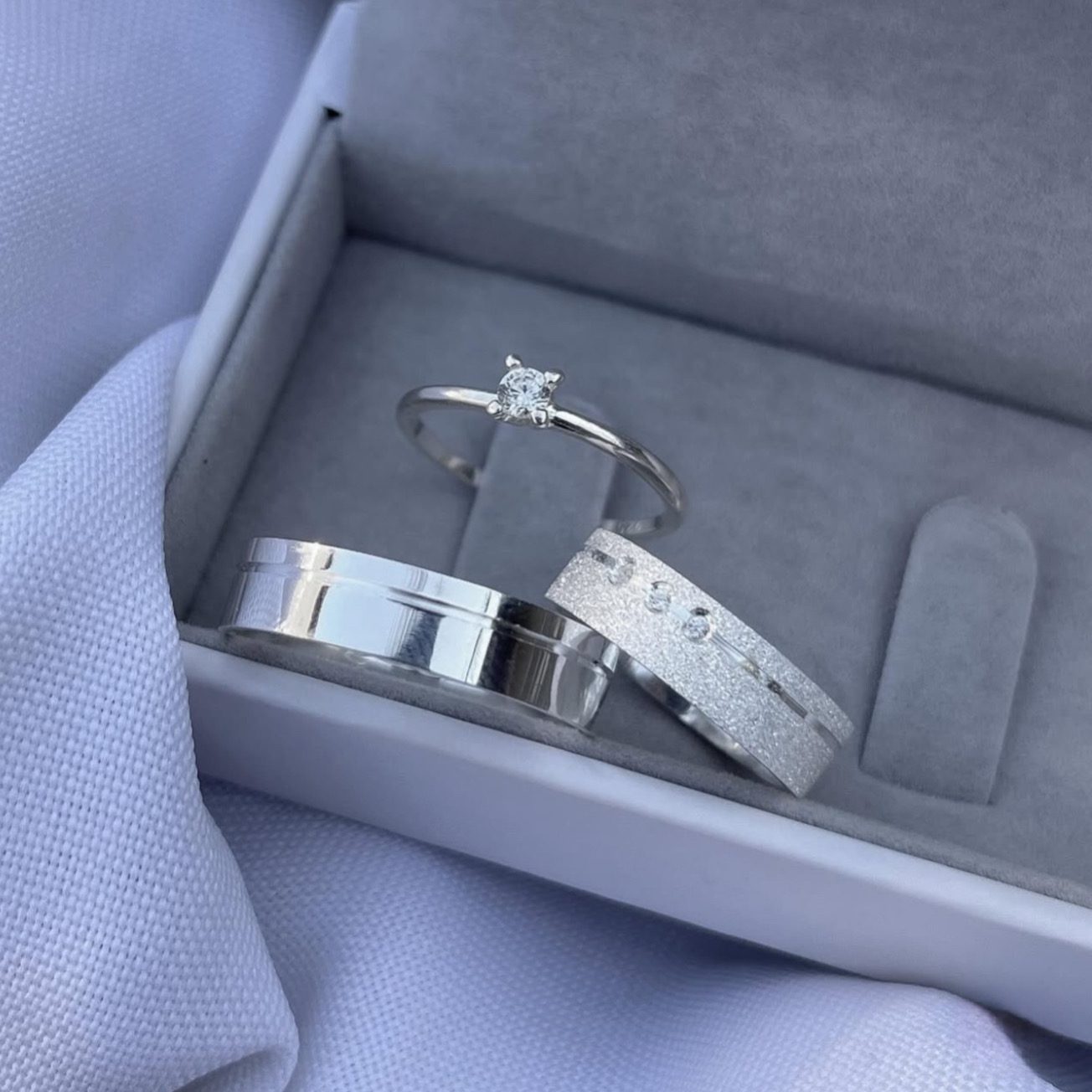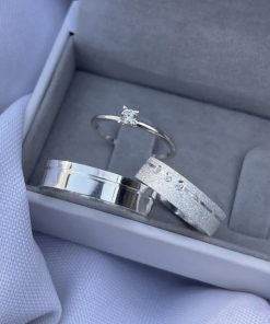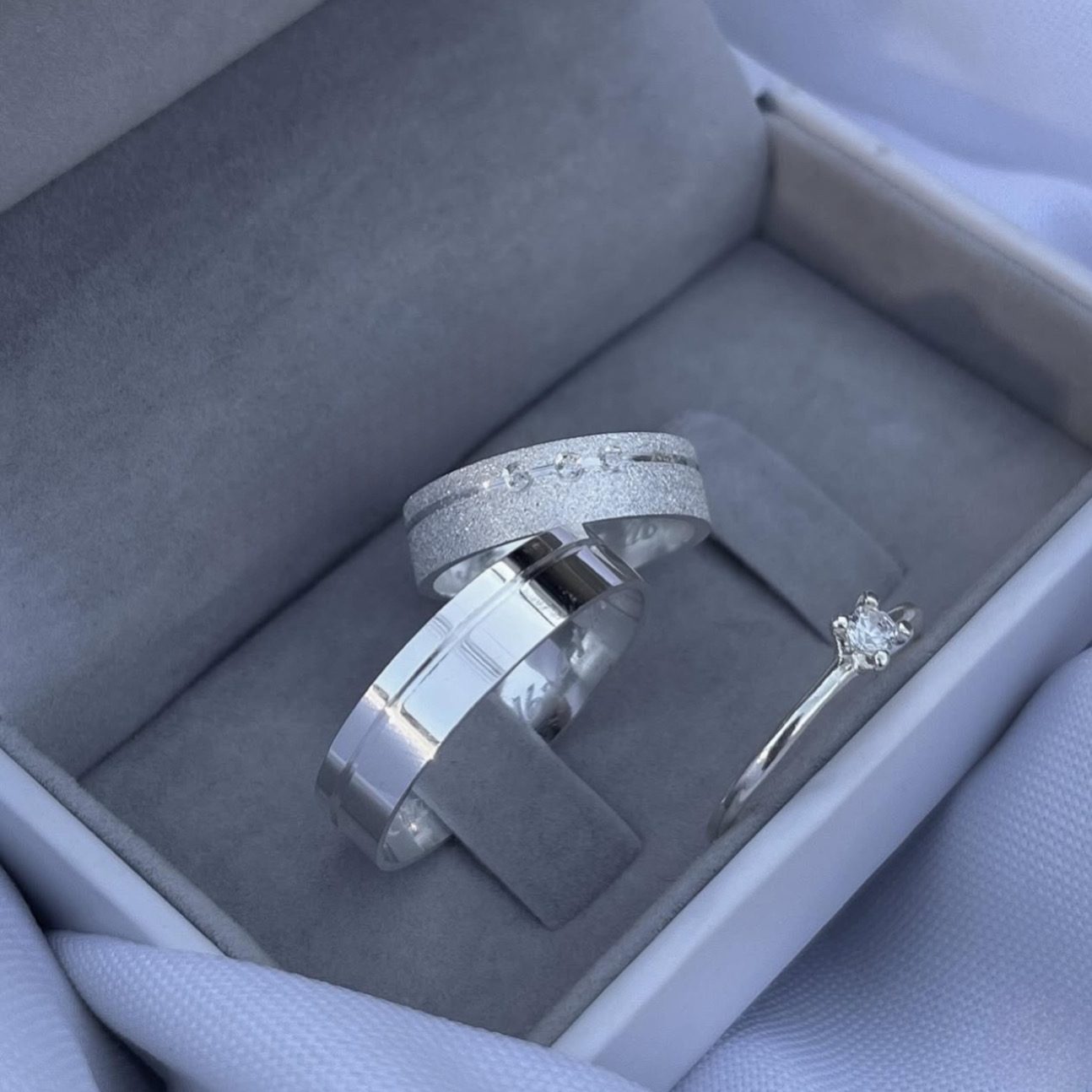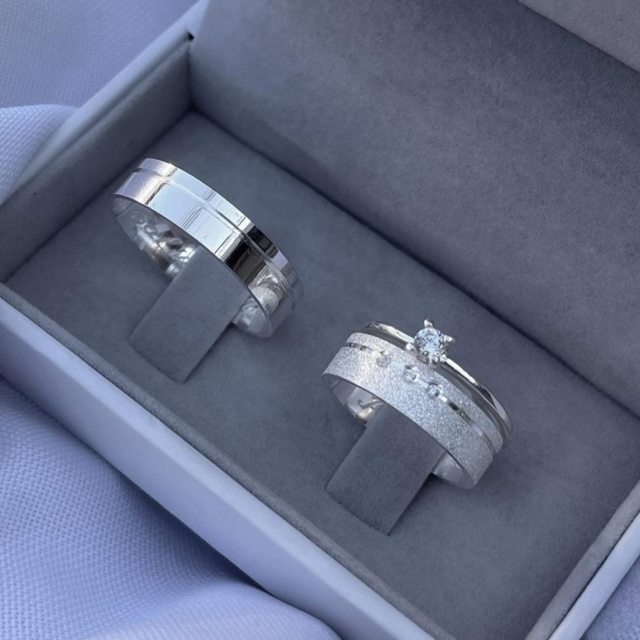 Já a masculina é lisa e polida, mantendo o mesmo friso lateral para garantir harmonia ao par.