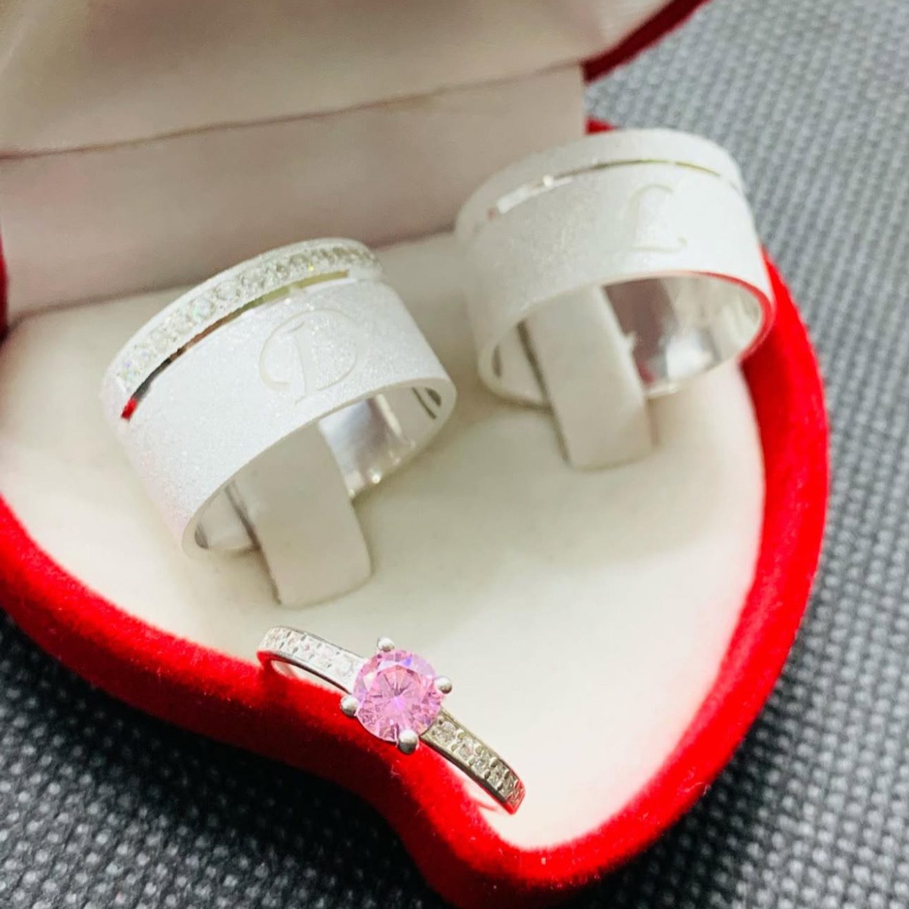 A aliança feminina é delicadamente adornada com 15 pedras de zircônia dispostas em meia volta, realçando o brilho da peça. O destaque especial é o anel solitário incluso, com pedra de zircônia rosa e gravação das letras iniciais do casal, tornando o conjunto ainda mais único e significativo.