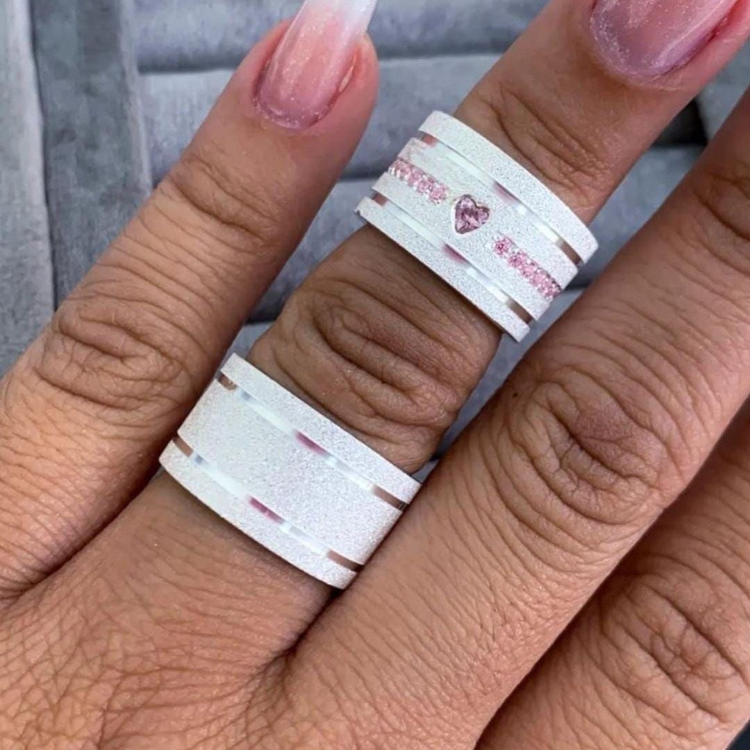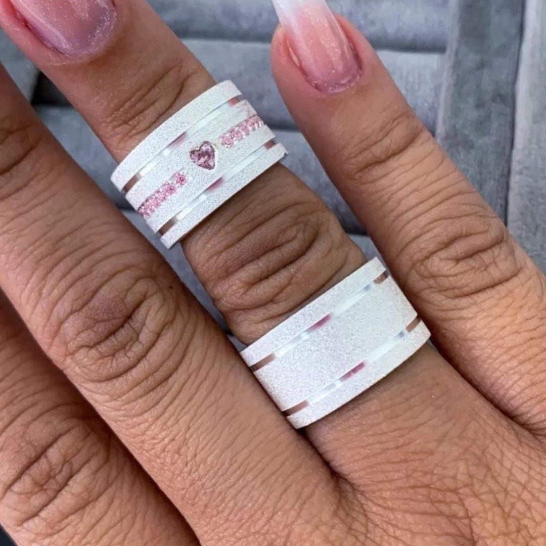 • Modelo Feminino: Coração vazado cravejado com 1 pedra de zircônia rosa no centro, mais 5 pedras de zircônia em cada lateral, totalizando 11 pedras, para um toque romântico.
