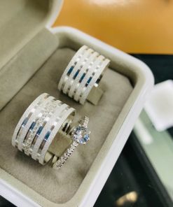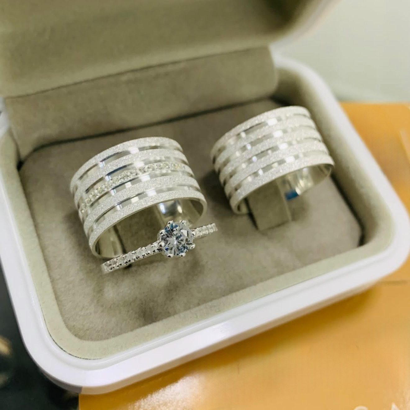 A aliança feminina é detalhadamente trabalhada com cinco frisos diamantados, sendo o friso central cravejado com 15 pedras de zircônia, proporcionando brilho intenso e elegância à peça.
