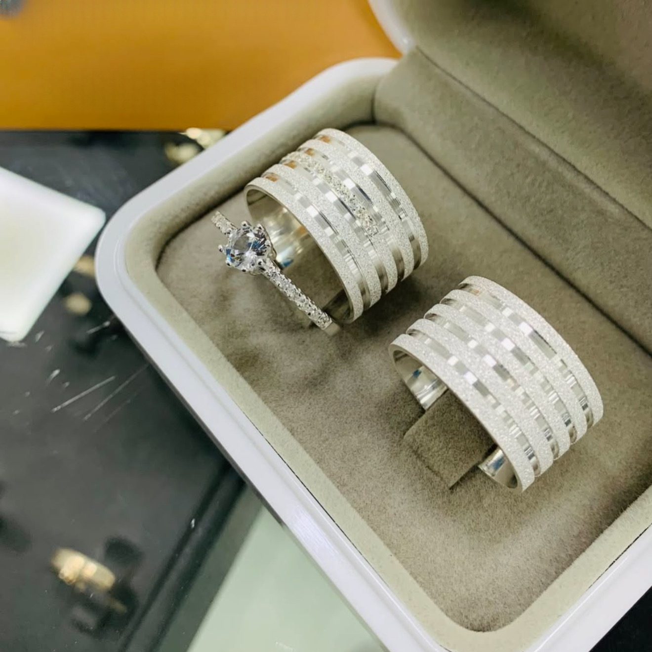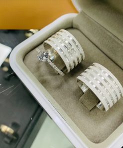 A aliança masculina mantém o mesmo estilo com os cinco frisos diamantados, porém sem pedras, garantindo um visual imponente e harmonioso ao conjunto.