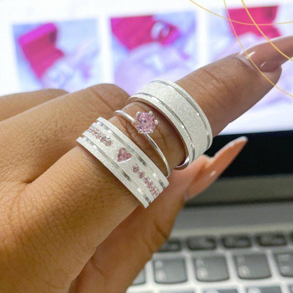 Alianças de Namoro em Prata 950 8mm | Modelo Frozen | Diamantado com 2 Frisos Laterais | Feminino com 11 Pedras de Zircônia em Formato de Coração