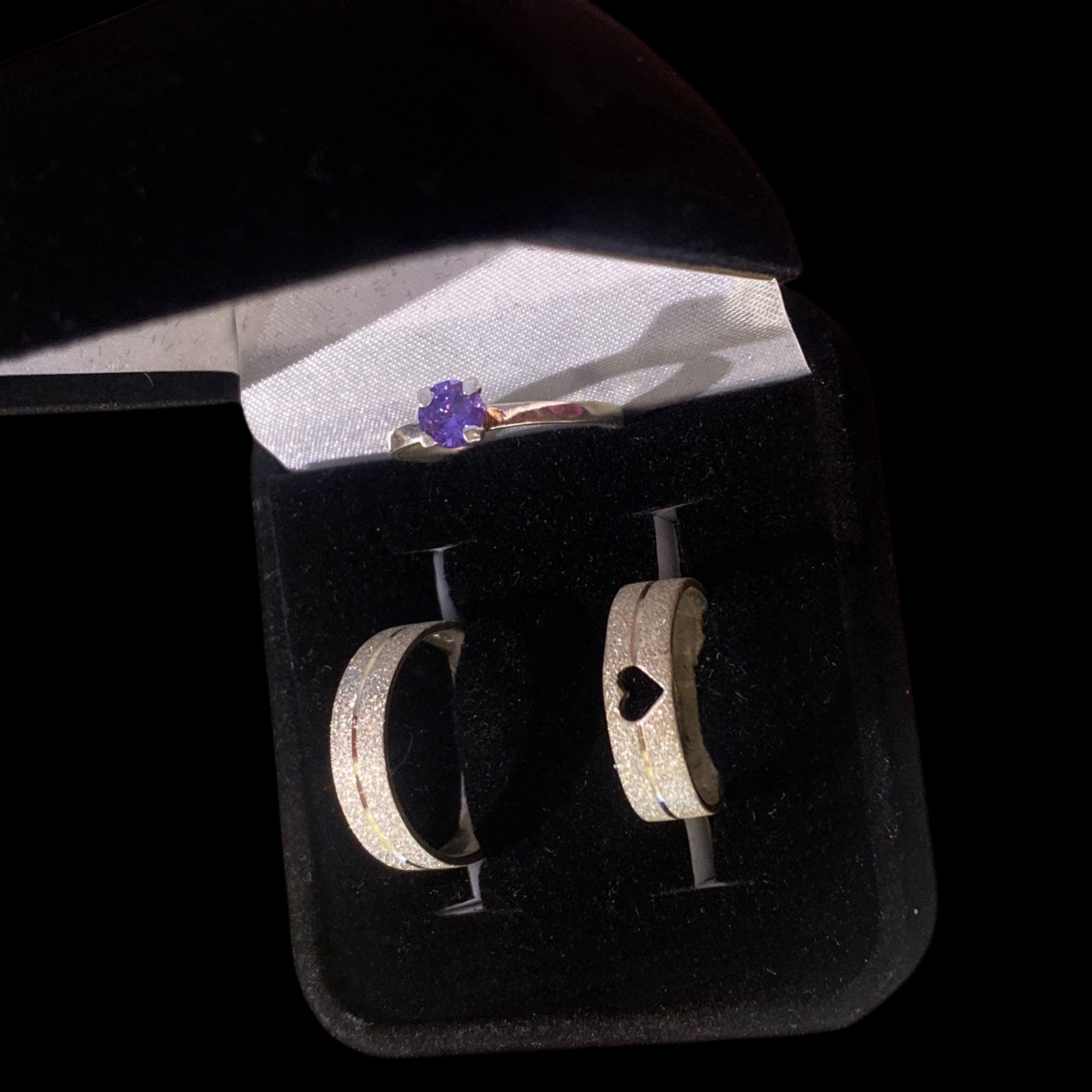 As Alianças de Namoro em Prata 950, com 5mm de largura, possuem acabamento diamantado e um friso central que confere elegância e brilho. O modelo feminino é ainda mais especial com um coração vazado, simbolizando o amor. O anel solitário opcional, com pedra de zircônia na cor roxa, pode ser adicionado para personalizar a peça, tornando-a ainda mais única.