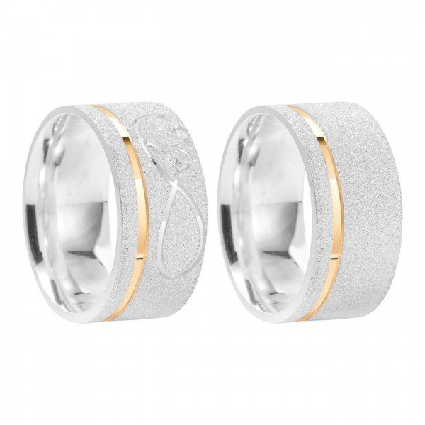 Alianças de namoro prata 950 Personalizado Todo Diamantado – Simbolo do Infinito na feminina – Masculina toda diamantada 8mm MOD 016- Friso lateral banhado a ouro 18k