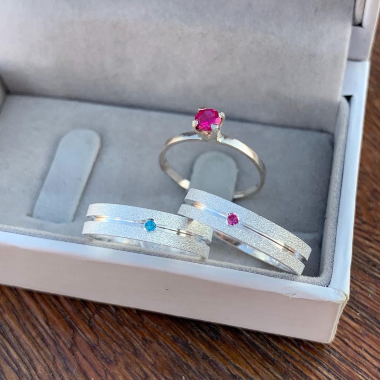 As Alianças de Namoro em Prata 950, com largura de 5mm e acabamento semi anatômico, oferecem o equilíbrio perfeito entre conforto e sofisticação. O modelo diamantado com friso central largo é elegante e moderno, proporcionando um brilho sutil e uma aparência refinada. O modelo feminino apresenta uma delicada pedra de zircônia rosa, posicionada dentro do friso, enquanto o modelo masculino exibe uma pedra de zircônia azul, igualmente situada no friso central. Para completar o conjunto, um anel solitário opcional, com pedra rosa, complementa o visual, tornando as alianças ainda mais especiais.