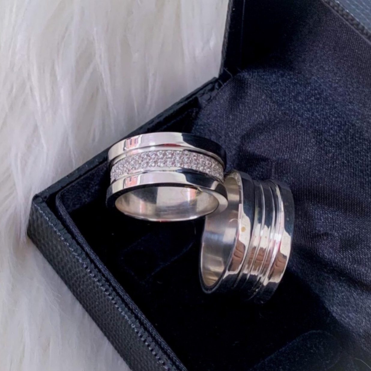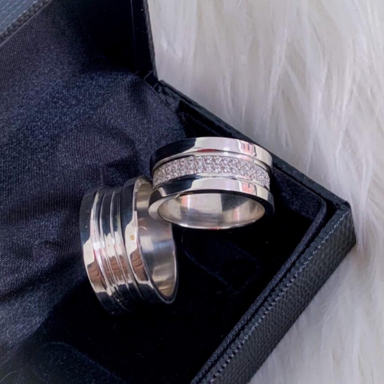 A aliança feminina é um verdadeiro destaque, com 30 pedras de zircônia branca dispostas em duas fileiras centrais (15 de cada lado) em meia volta, proporcionando um brilho sofisticado e atemporal. Já a aliança masculina mantém o acabamento liso polido, garantindo um design equilibrado e elegante.
