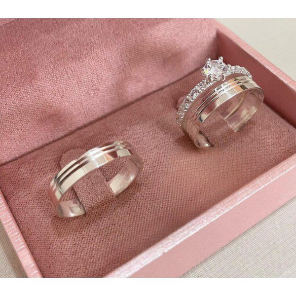 O formato semi anatômico proporciona conforto ideal para o uso diário, garantindo um encaixe agradável no dedo. Para complementar o conjunto, há a opção de incluir um anel solitário cravejado com pedras de zircônia, agregando ainda mais brilho e sofisticação ao modelo.