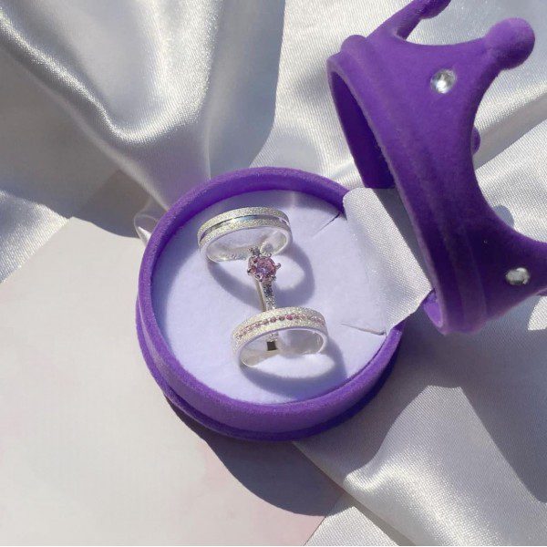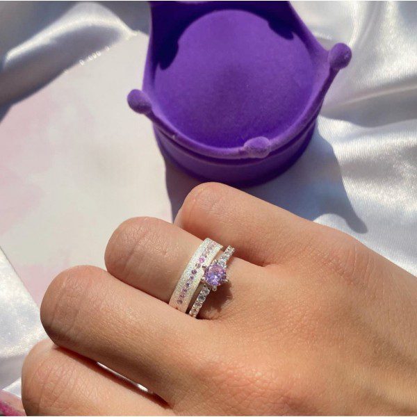 Alianças de Namoro em Prata 950 5mm | Todo Diamantado com 1 Friso Central Largo | Feminina com 15 Pedras de Zircônia Lilás | Modelo Semi Anatômico