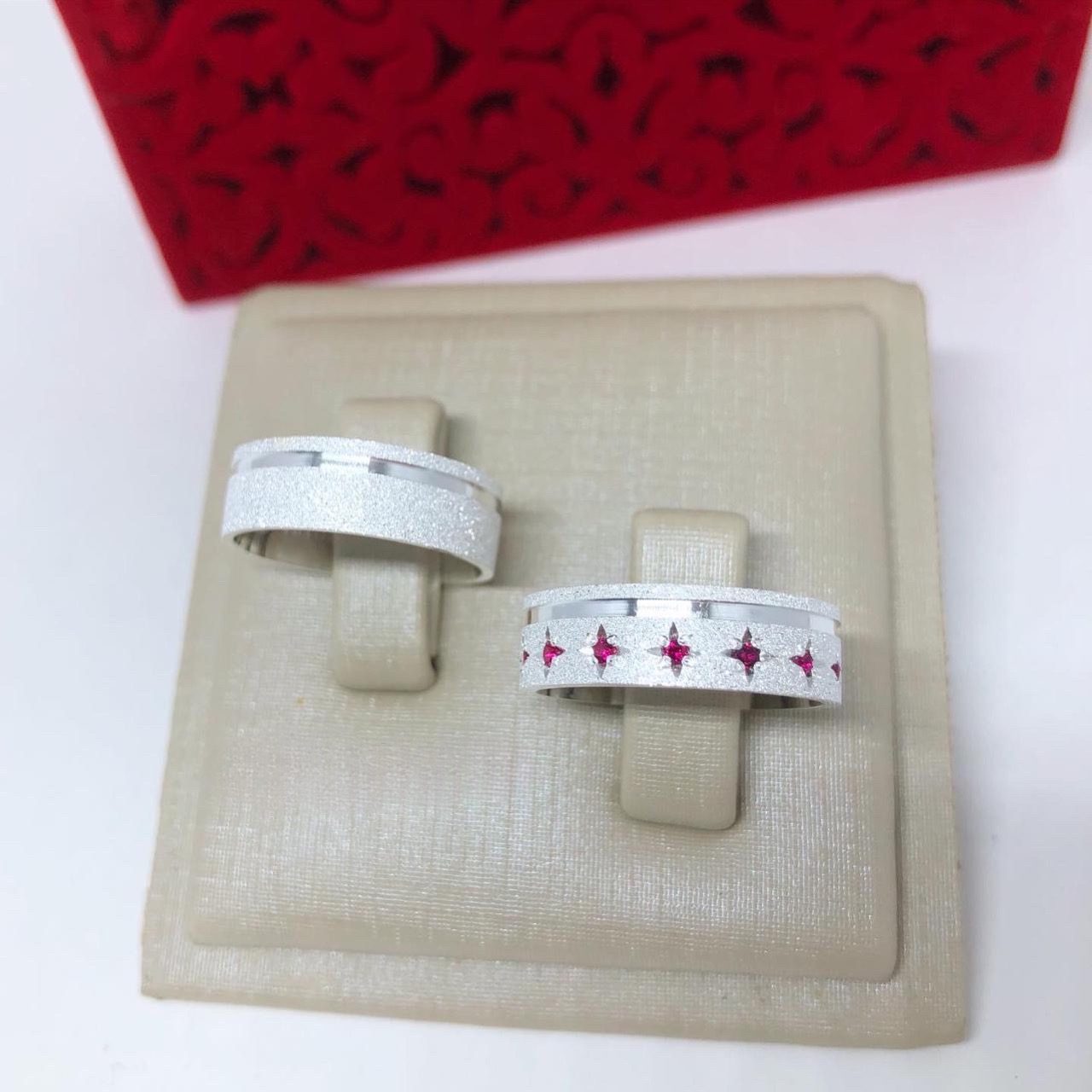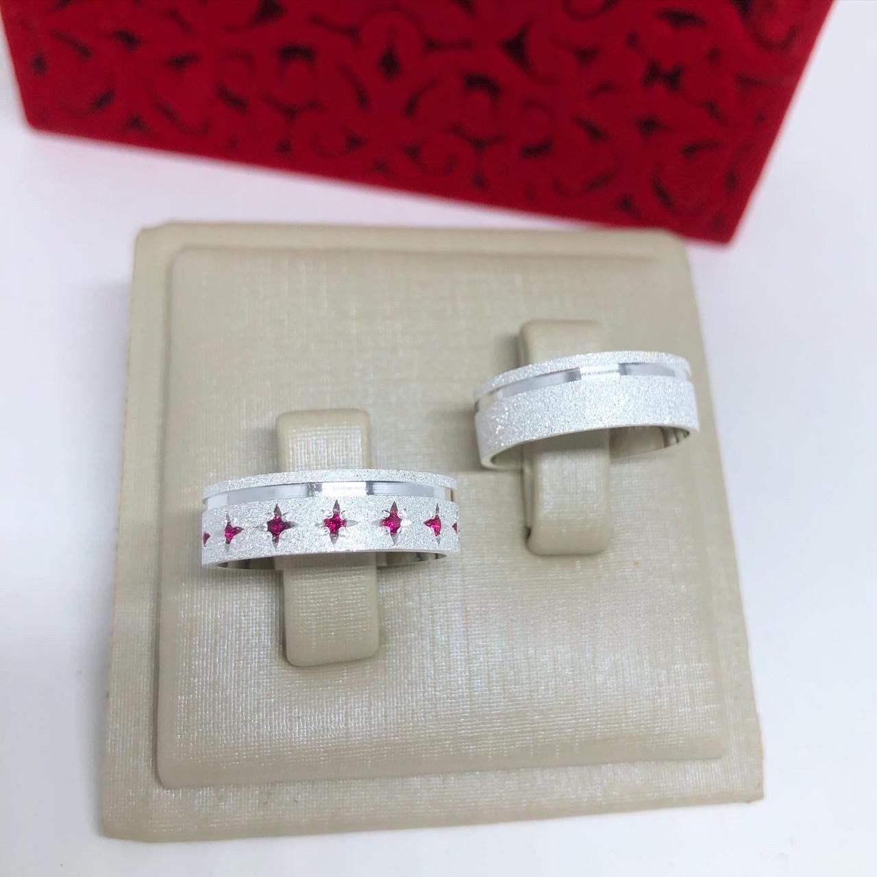 As Alianças de Namoro em Prata 950 com 6mm de largura apresentam um design sofisticado e confortável com acabamento diamantado e 1 friso lateral. O modelo feminino é adornado com 7 pedras de zircônia no formato de estrela, proporcionando um toque de brilho e delicadeza. A aliança masculina segue o mesmo design, porém sem as pedras, mantendo a elegância e simplicidade.