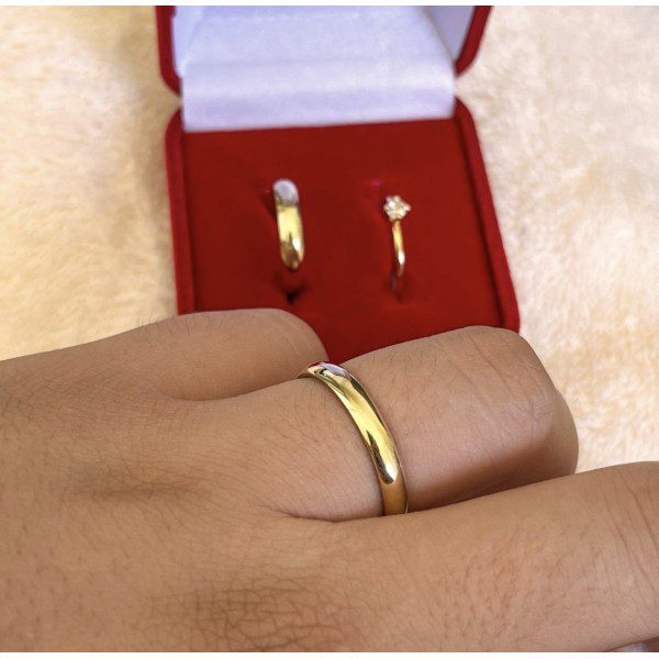 É uma aliança com estrutura interna de aço cirúrgico, recoberta por uma chapa de Ouro 10K fixada com tecnologia avançada. Essa técnica proporciona a aparência luxuosa do ouro com uma estrutura resistente e confortável, garantindo maior longevidade e brilho intenso.