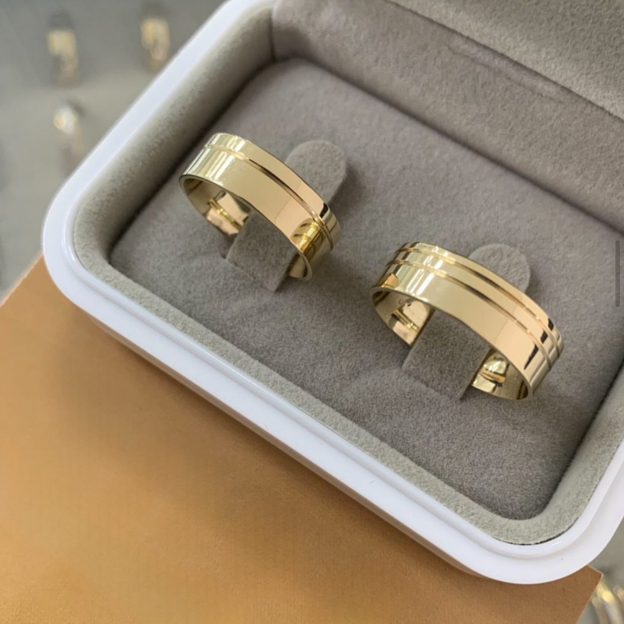 • Aliança masculina: conta com 2 frisos laterais, conferindo um visual mais marcante e robusto.