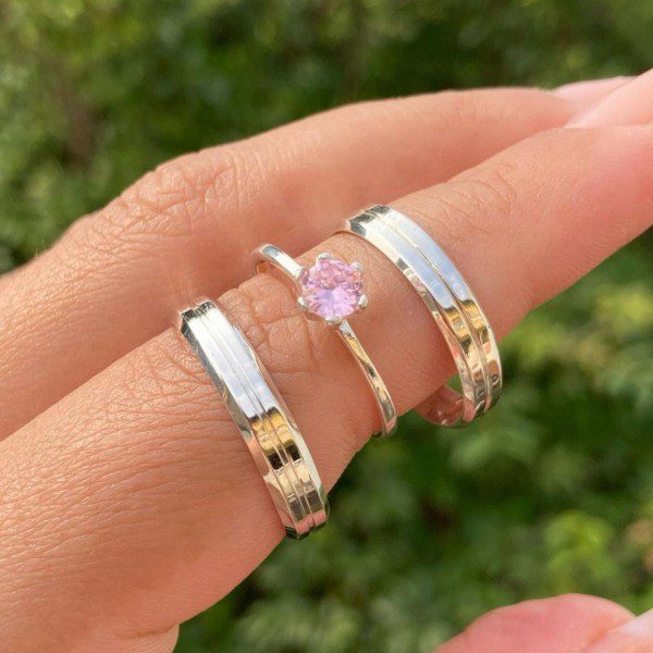 Alianças de Namoro em Prata 950 4mm | Liso Polido | Chanfrado com 1 Friso Central | Anel Solitário Opcional com Pedra de Zircônia Rosa