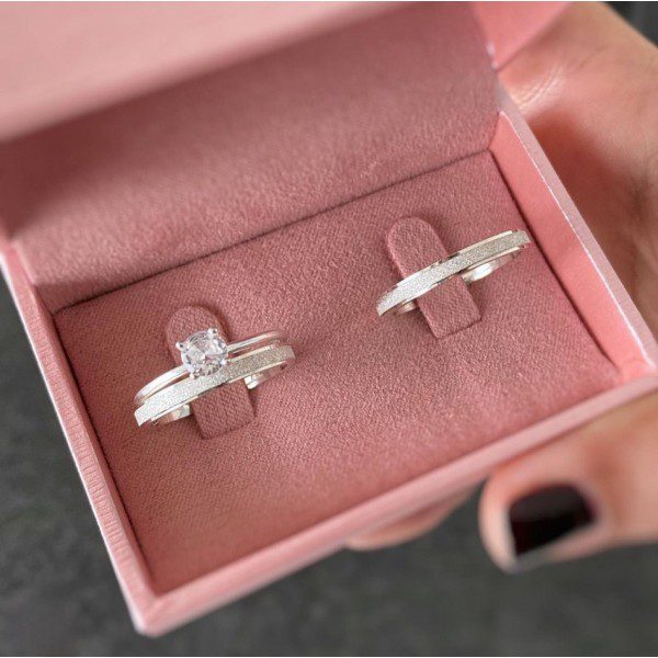 O formato semi anatômico garante um encaixe confortável para o uso diário. Para complementar o conjunto, há a opção de incluir um anel solitário opcional cravejado com pedra de zircônia, agregando ainda mais brilho e sofisticação ao modelo.