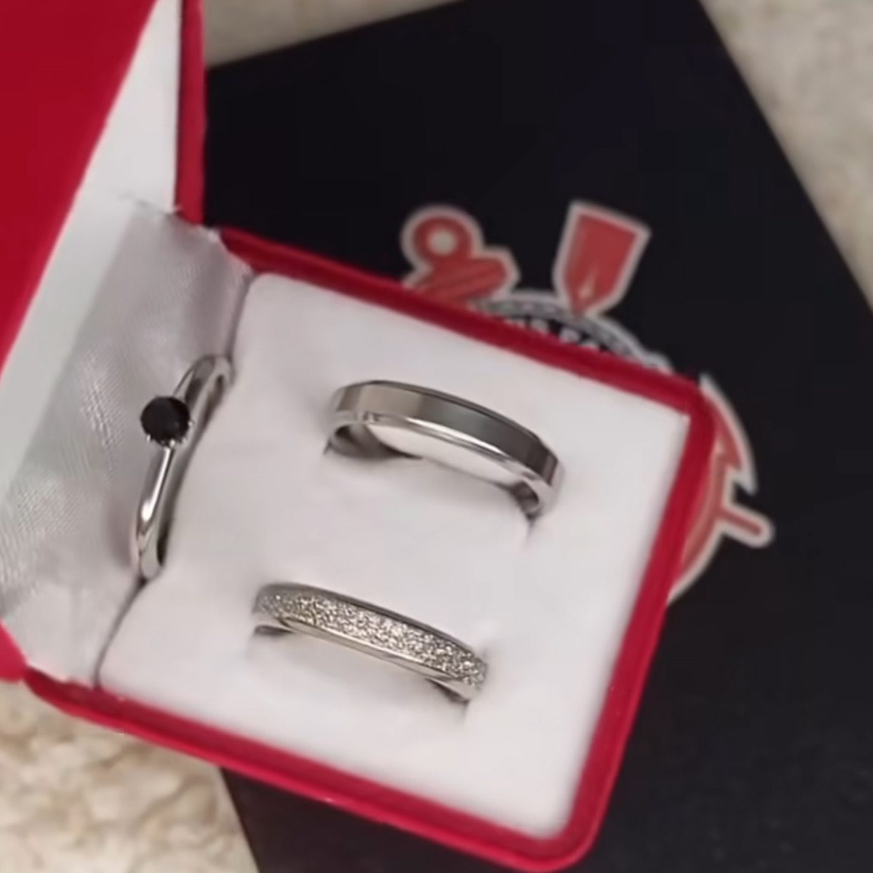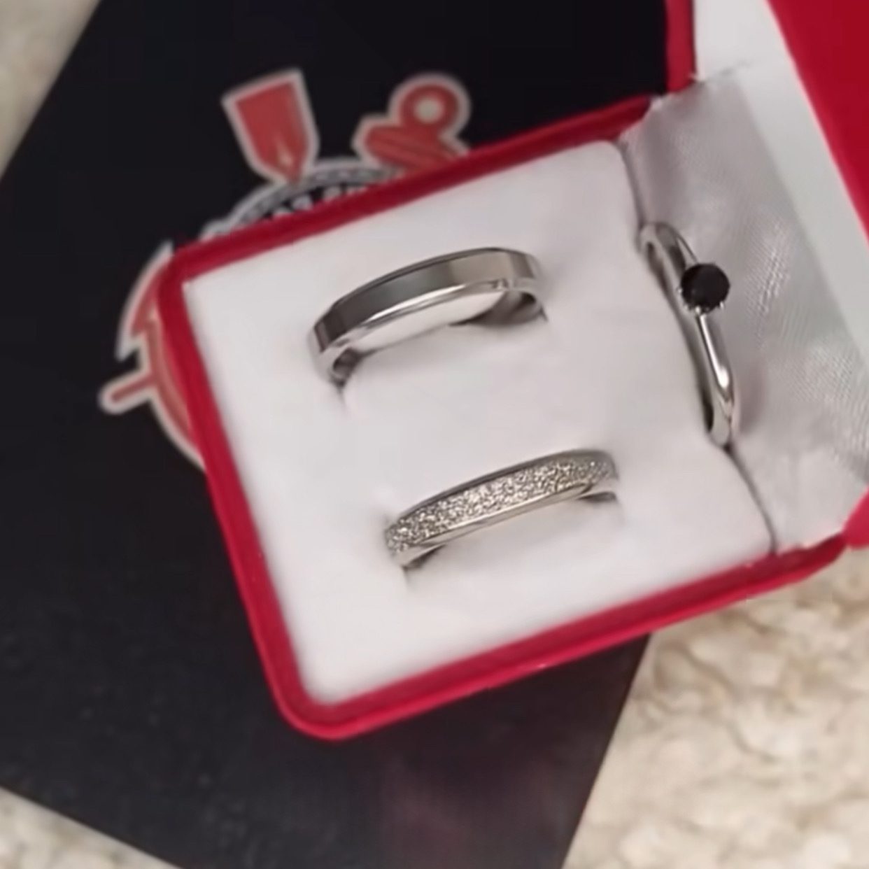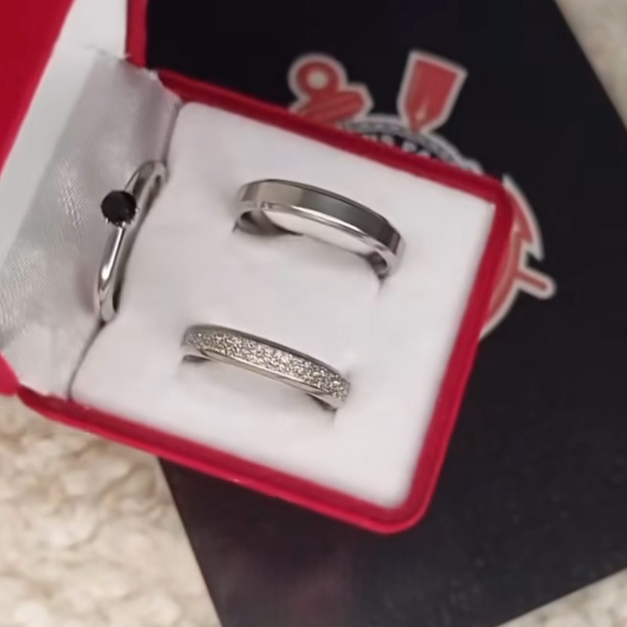 Par de alianças prata em aço cirúrgico 4mm; Anel Pedra Preta Opcional – Ideal para namoro, noivado e compromisso.