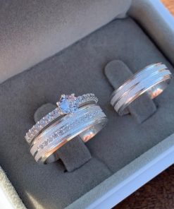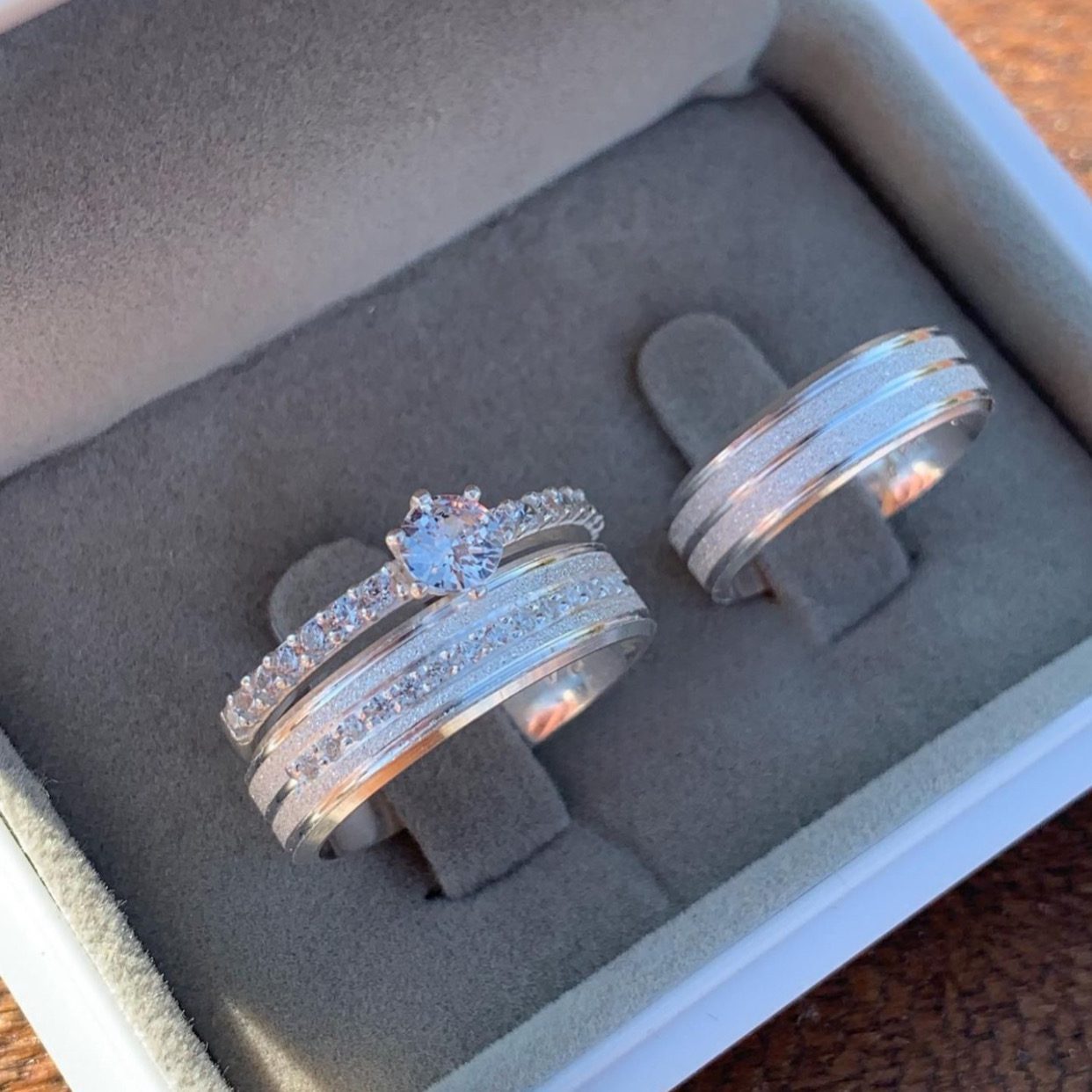 • Feminina com pedras de zircônia, masculina com o design liso e frisos.