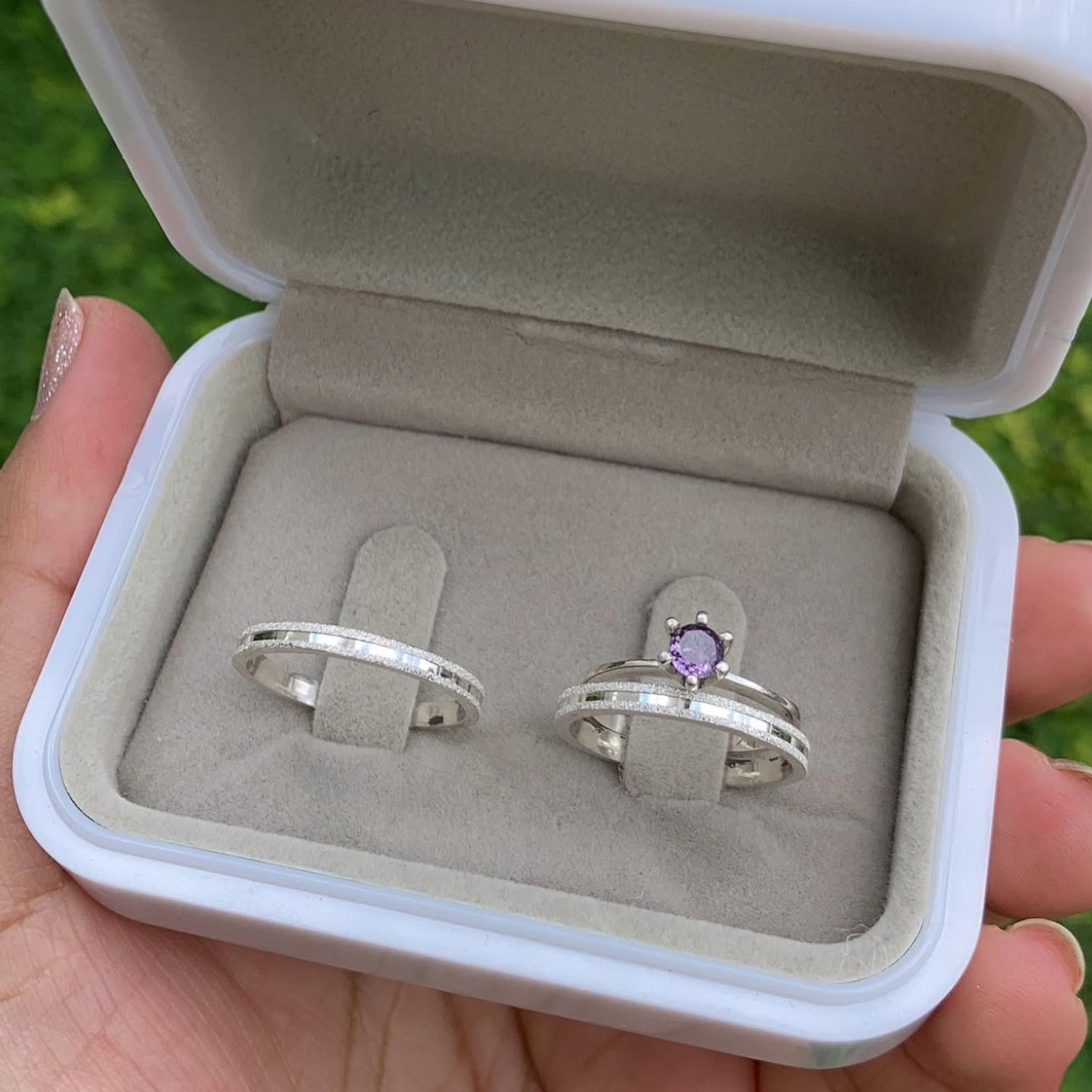 As Alianças Finas de Namoro em Prata 950, modelo Fino, foram desenvolvidas para casais que apreciam delicadeza e sofisticação. Com 2mm de largura, o design todo diamantado e o friso central largo proporcionam um brilho elegante e moderno. O modelo semi anatômico oferece conforto no uso diário, tornando-o perfeito para simbolizar um amor único. O conjunto acompanha um anel solitário cravejado com pedra de zircônia na cor lilás, agregando charme e exclusividade à peça.