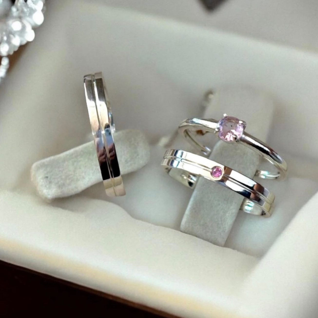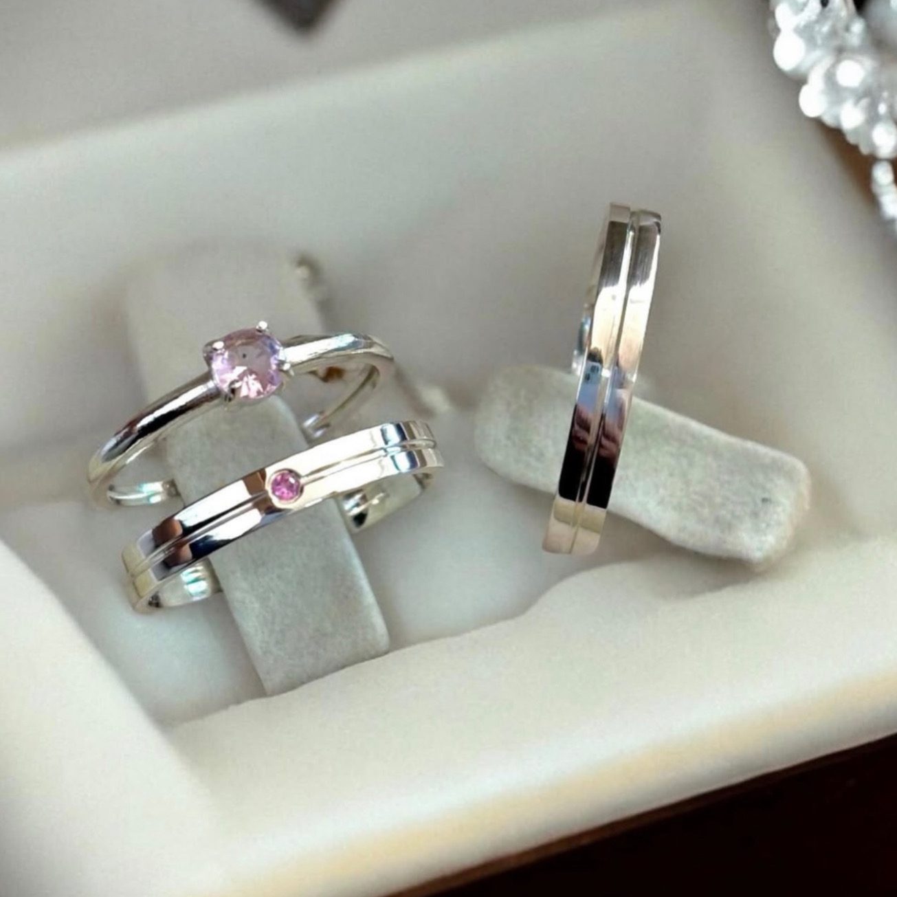 A aliança feminina possui 1 pedra de zircônia dentro do friso, realçando ainda mais o brilho e a beleza da peça. A masculina mantém o visual liso e clássico com o mesmo friso central. O conjunto acompanha um anel solitário incluso, cravejado com pedra de zircônia na cor rosa, tornando o kit ainda mais especial.