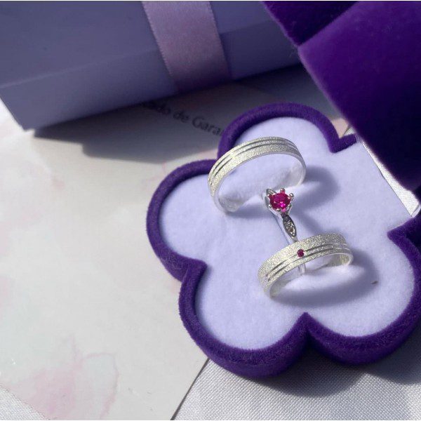 A aliança feminina se destaca pela pedra de zircônia rosa posicionada entre os frisos, proporcionando um toque delicado e romântico. O modelo masculino mantém o mesmo acabamento diamantado com 2 frisos laterais, garantindo um visual equilibrado e sofisticado.