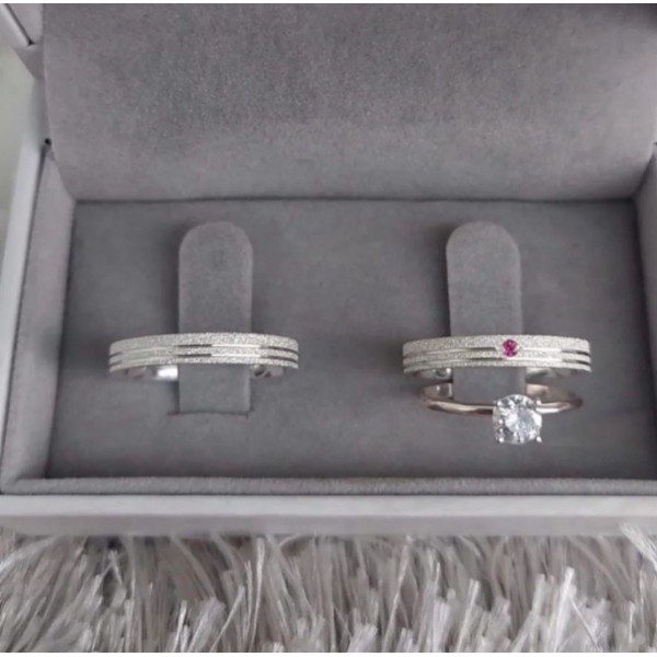 O modelo feminino se destaca pela pedra de zircônia rosa posicionada entre os frisos, adicionando charme e sofisticação à peça. O modelo masculino mantém o acabamento diamantado com 2 frisos laterais, garantindo um visual equilibrado e sofisticado.