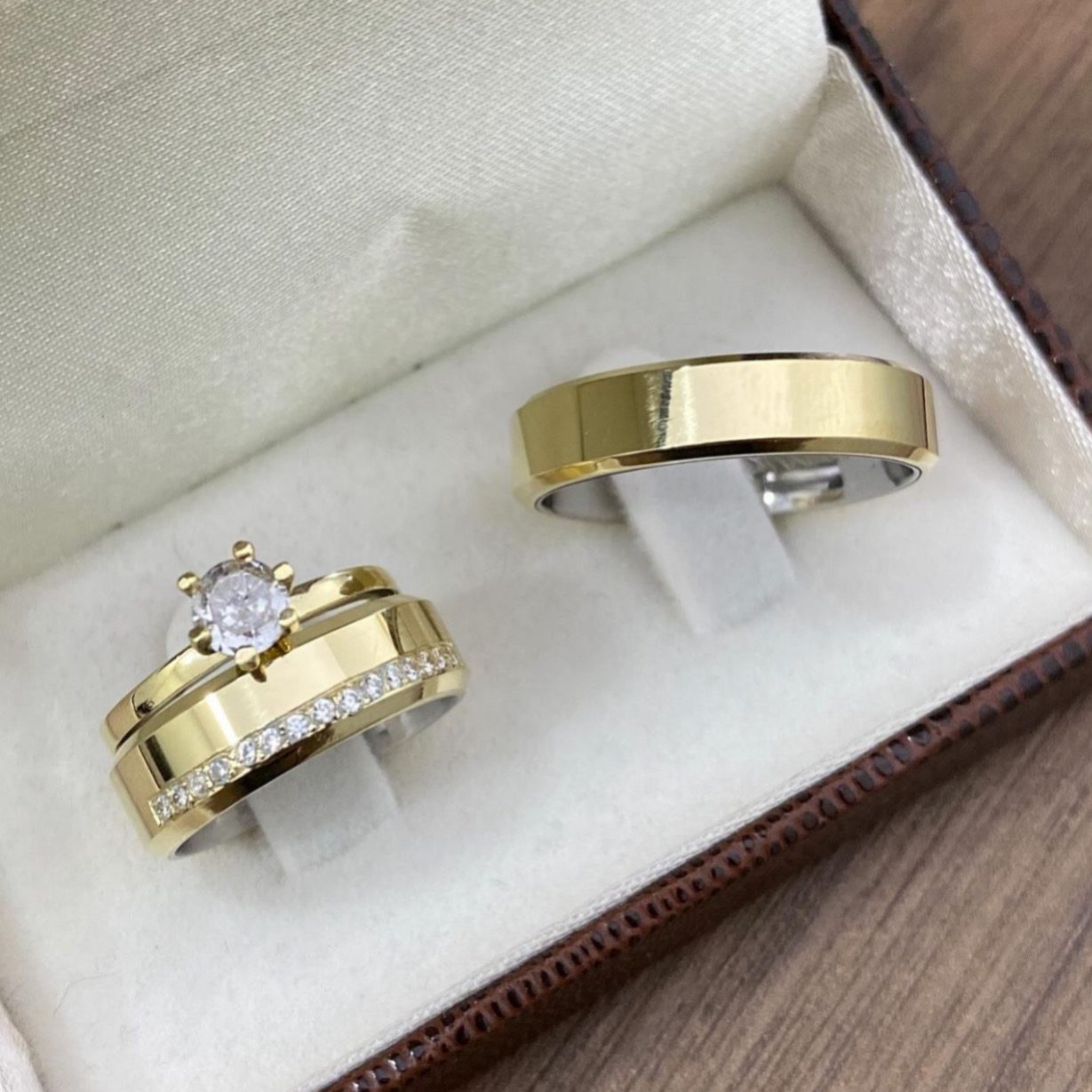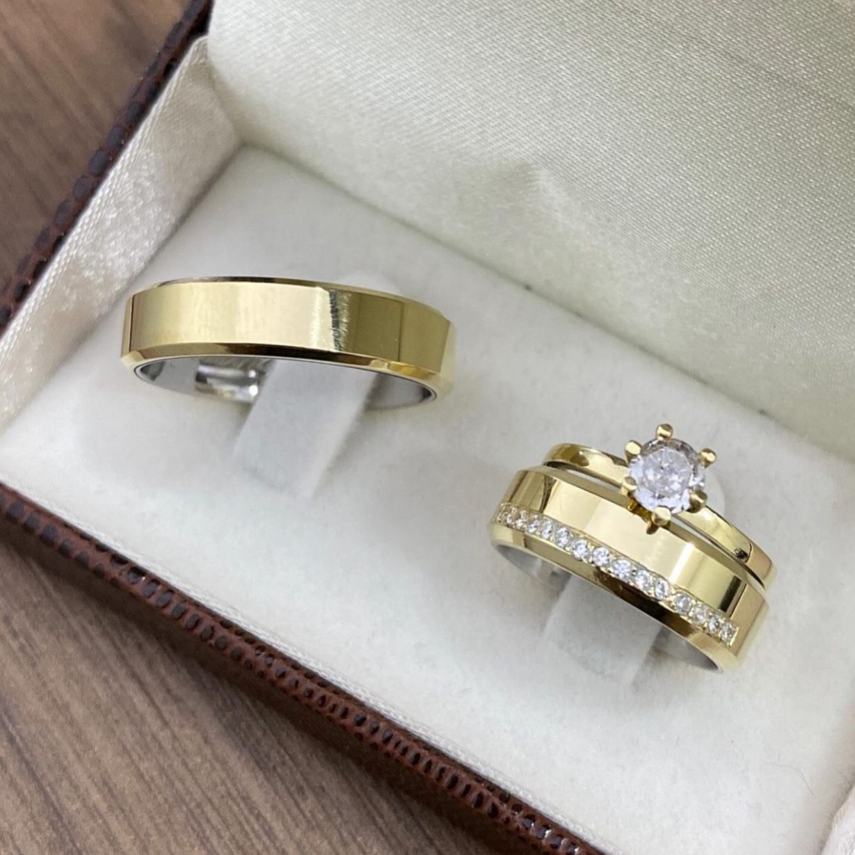 É uma aliança com estrutura interna de prata, recoberta por uma chapa de Ouro 10K fixada com tecnologia avançada. Essa técnica proporciona a aparência luxuosa do ouro com uma estrutura resistente e confortável, garantindo maior longevidade e brilho intenso.