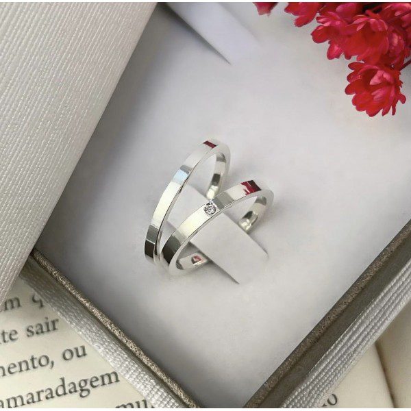 O modelo feminino se destaca por possuir uma pedra de zircônia central, proporcionando brilho e um toque especial de sofisticação. O modelo masculino mantém um acabamento liso e polido, garantindo um visual clássico e equilibrado.